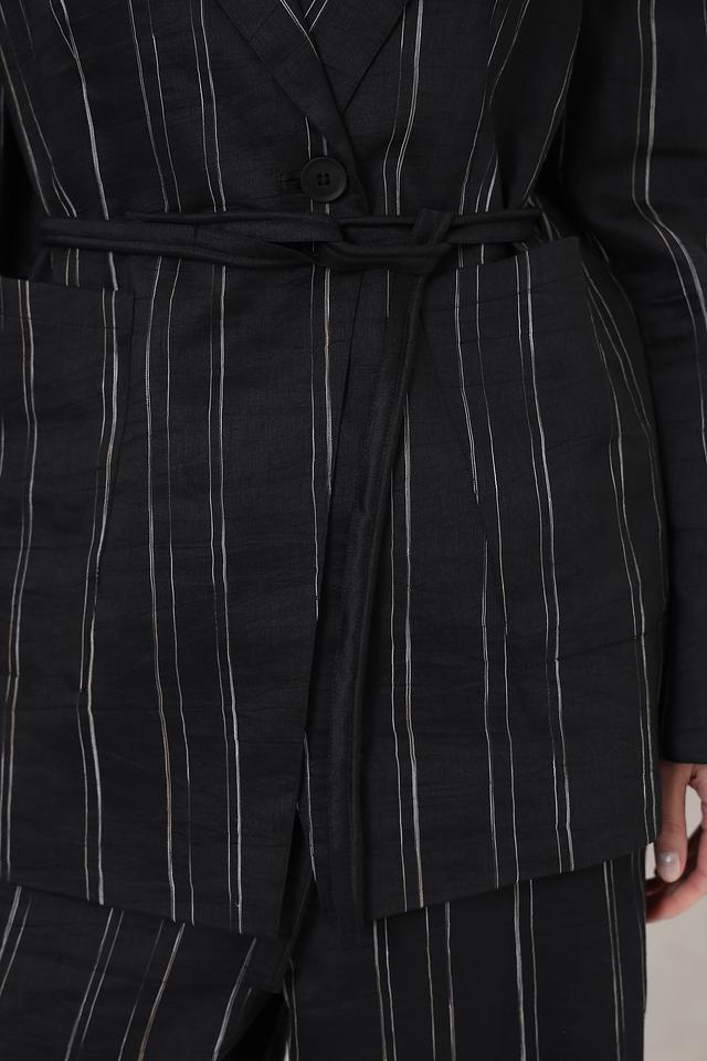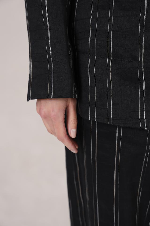Этот жакет от Annette Gortz станет незаменимой частью вашего гардероба. Классический чёрный цвет с тонкими белыми полосками делает его универсальным и подходящим для различных случаев.