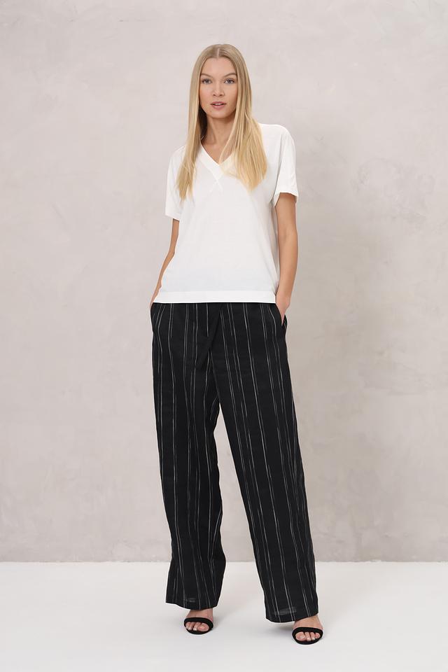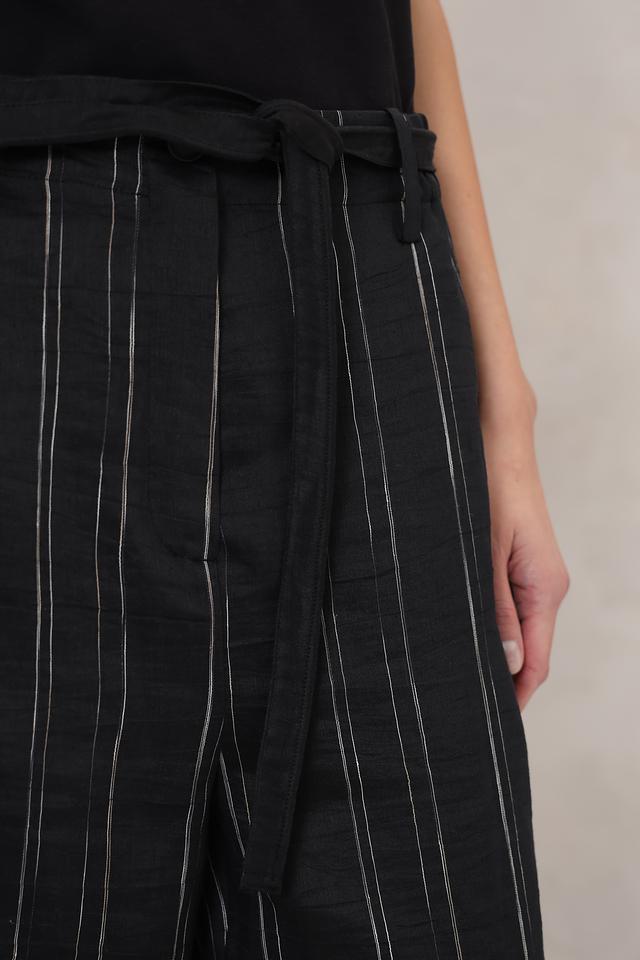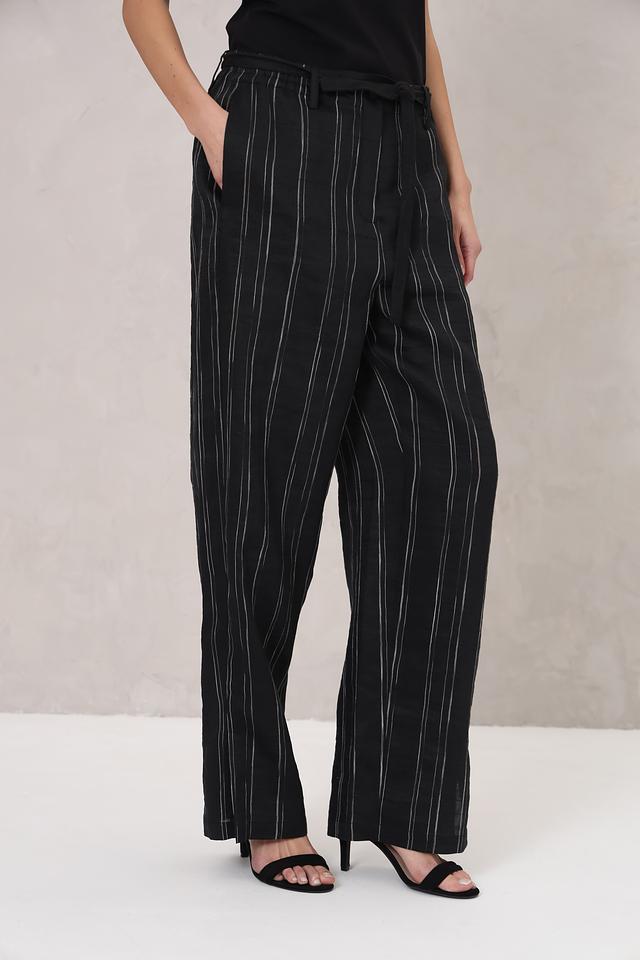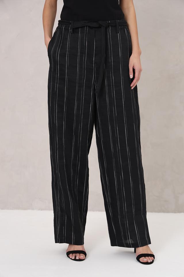 Женские брюки Annette Gortz чёрного цвета с вертикальной полоской выполнены из льна с добавлением полиэстера. Модель имеет завышенную талию и пояс на завязках, обеспечивающие комфортную посадку. Состав: лен 89%, полиэстер 11%
