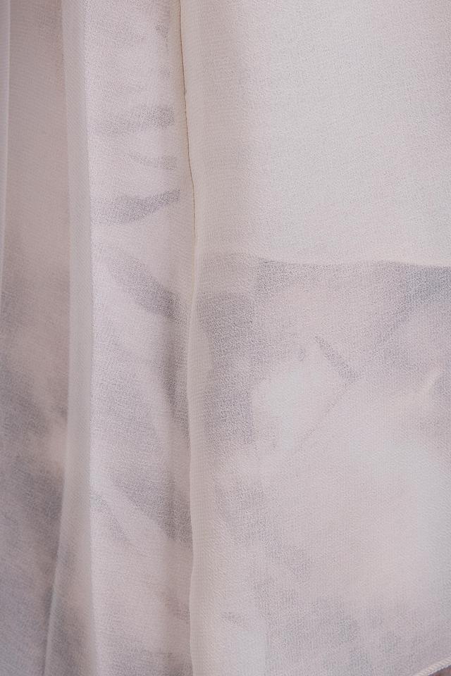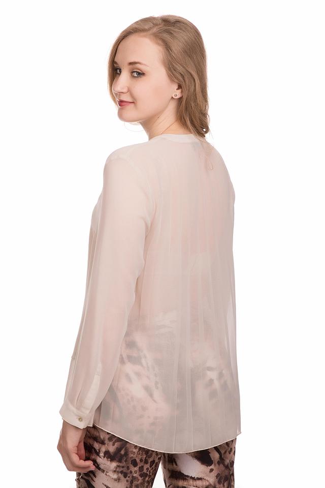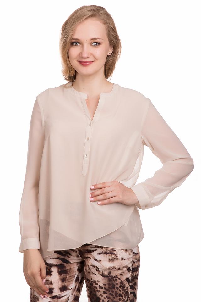 Модель отличается V-образным вырезом горловины и длинными рукавами. Передняя часть блузы застегивается на несколько небольших пуговиц в тон ткани. Особенностью данной модели является многослойность – верхний слой выполнен из полупрозрачной ткани, что придает блузе воздушность и легкость.