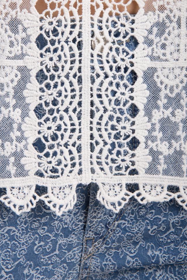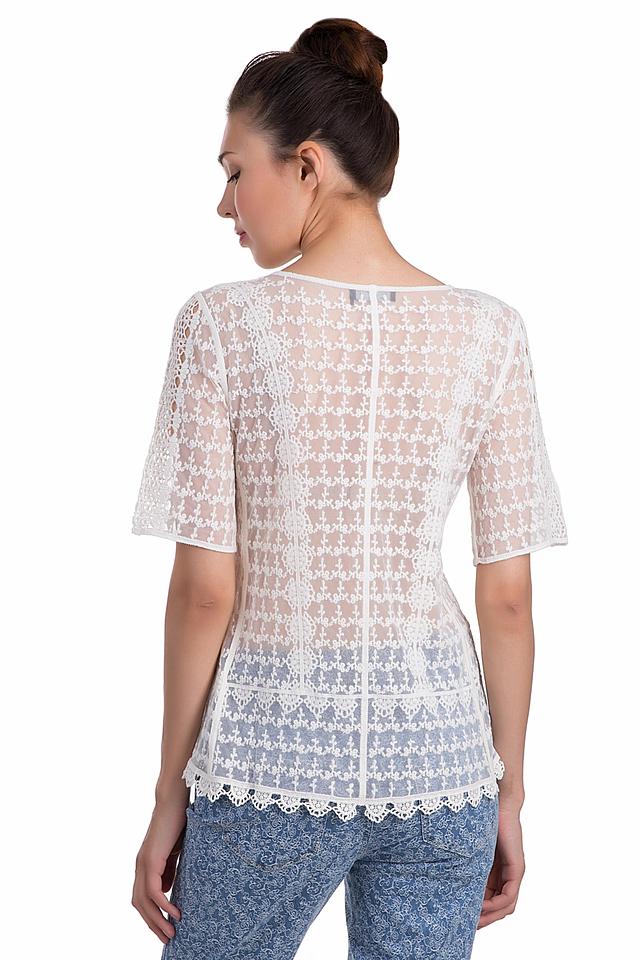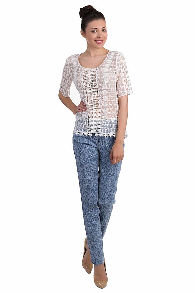 - Дизайн: Блуза украшена ажурным кружевом с цветочным мотивом и декоративной вставкой по центру переда. Рукава короткие, расклешенные, по низу изделия идет изящная кружевная кайма.