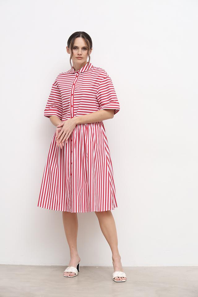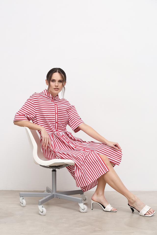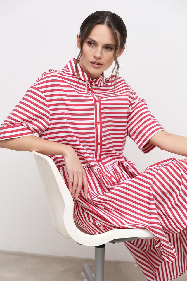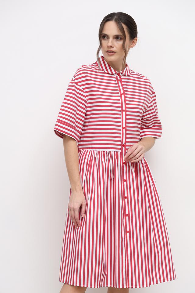 Платье выполнено в классическую красную полоску, которая визуально освежает образ и делает его более динамичным. Воротник рубашка и короткие рукава добавляют платью аккуратности и стиля. Застежка на пуговицах по всей длине переда позволяет регулировать степень прилегания.