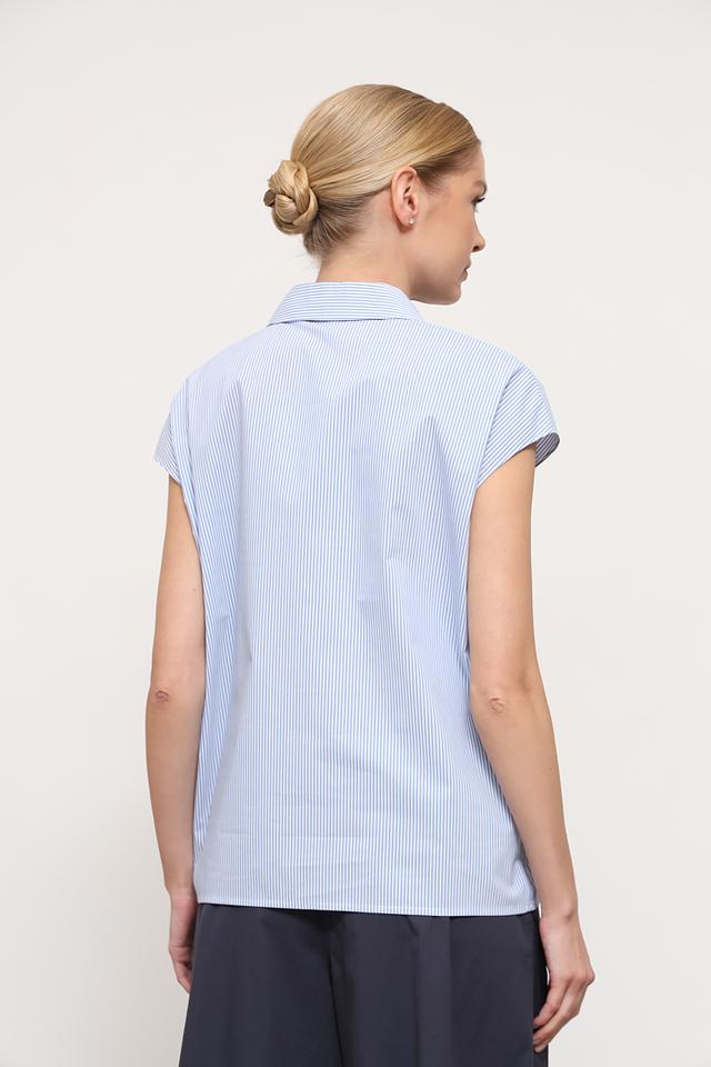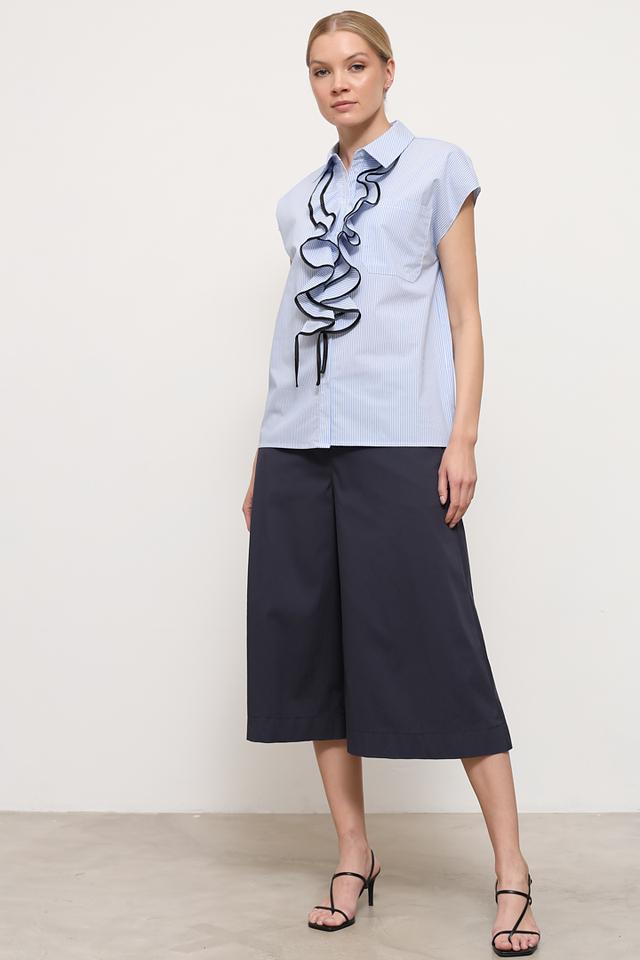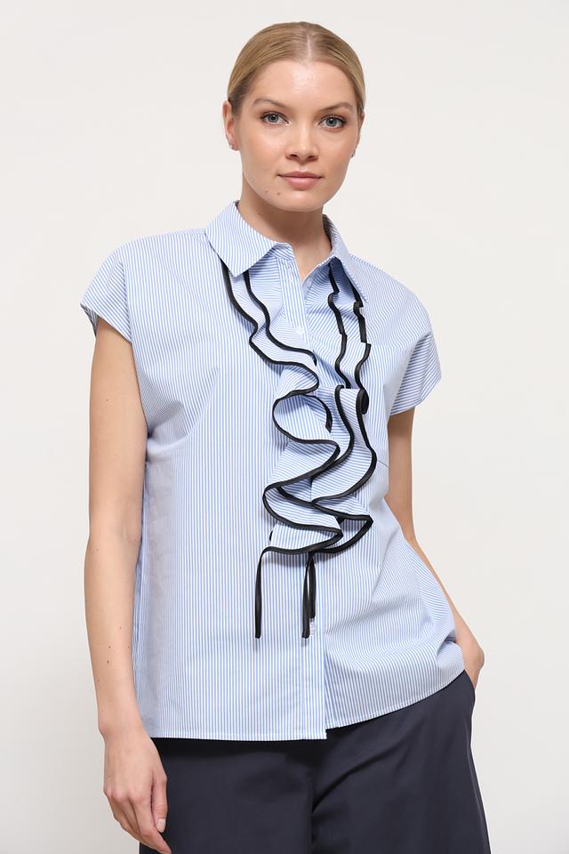 Рубашка имеет короткий рукав и классический крой, который подходит для различных типов фигур. Голубая полоска в сочетании с черными лентами-рюшами придает ей особый шарм и делает ее уникальной.