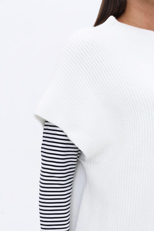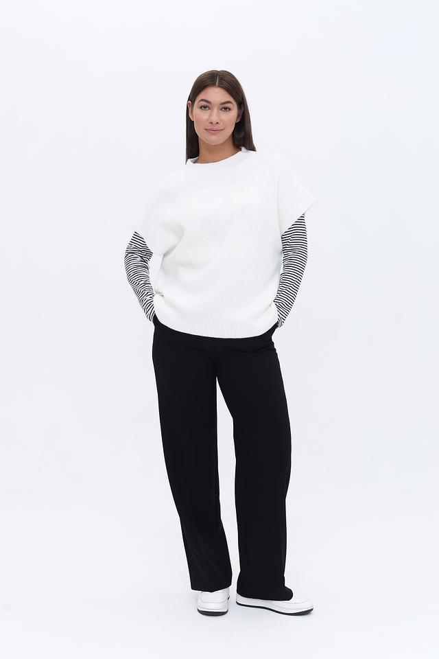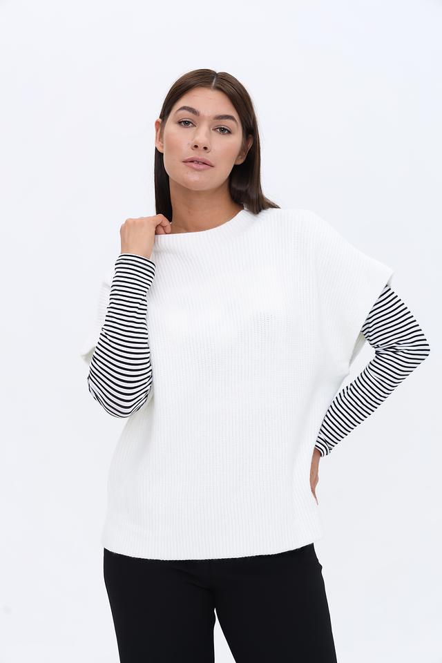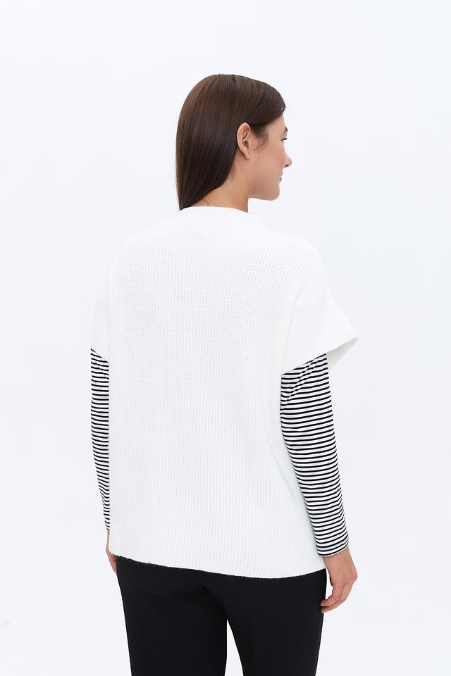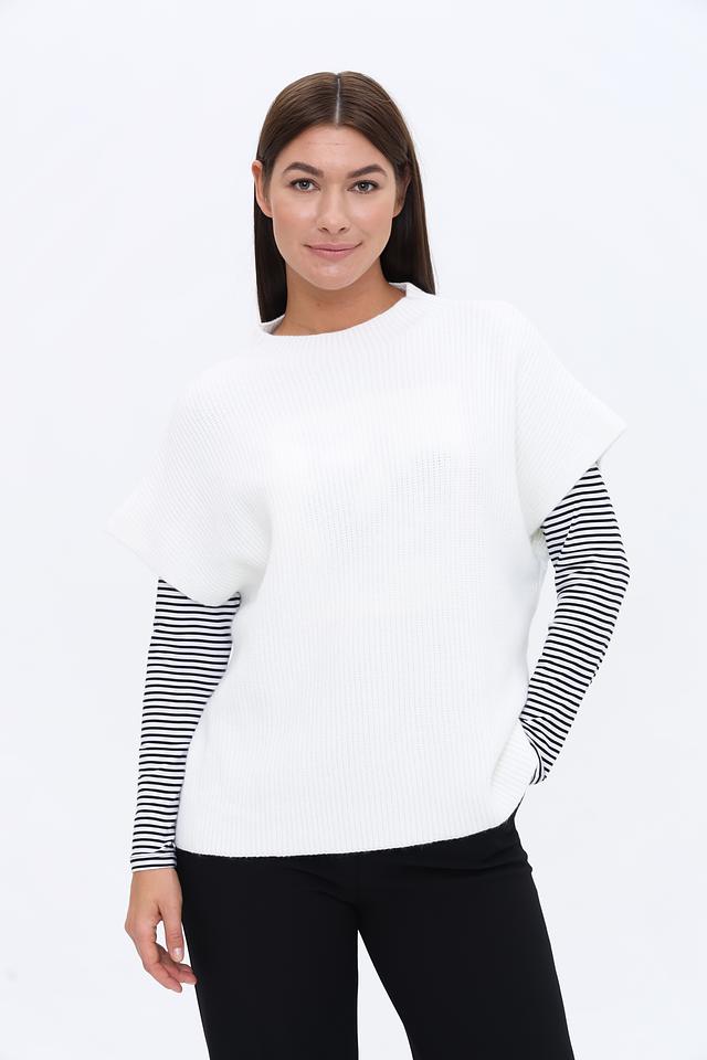 Этот жилет от Apart станет отличным дополнением к вашему гардеробу. Он выполнен в белом цвете и имеет оригинальный дизайн с полосатыми вставками по бокам и на рукавах. Жилет имеет свободный крой, который не сковывает движения и позволяет создавать различные образы.