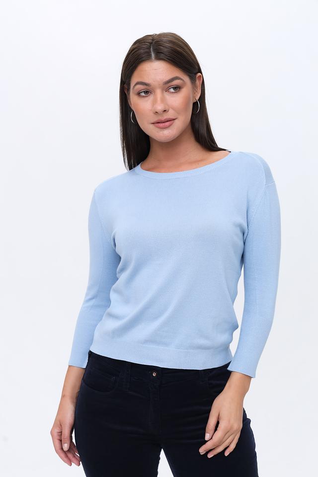 Пуловер имеет классический крой с округлым вырезом горловины и рукавом три четверти. Текстура вязки однородная, без выразительных узоров или декоративных элементов. Благодаря добавлению эластана, пуловер хорошо держит форму и не деформируется после стирки.