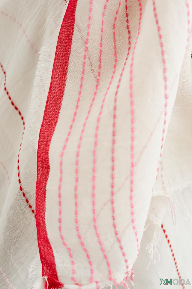 Шарф имеет легкую, воздушную текстуру, благодаря сочетанию хлопка, полиакрила и модала в составе. Это обеспечивает комфорт при ношении и приятные тактильные ощущения. Шарф достаточно длинный и широкий, что позволяет носить его различными способами – как классический шарф, палантин или накидку.