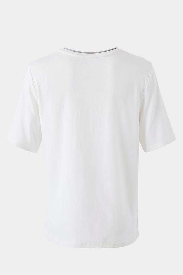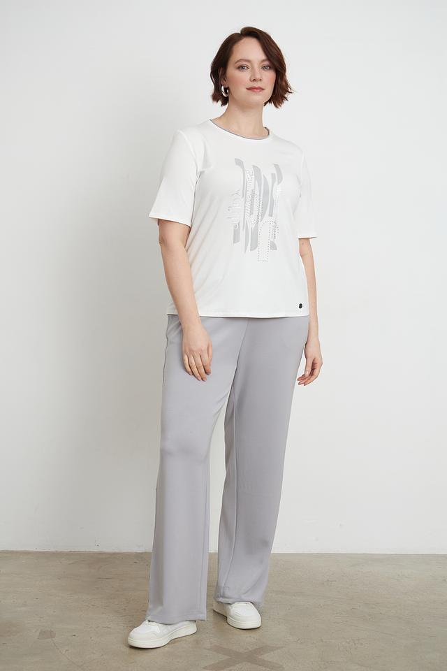 Модель имеет прямой крой, короткий рукав и круглый вырез горловины, отделанный тонкой тесьмой светло-голубого цвета. Главная особенность футболки — стильный графичный принт серого цвета на лицевой стороне.
