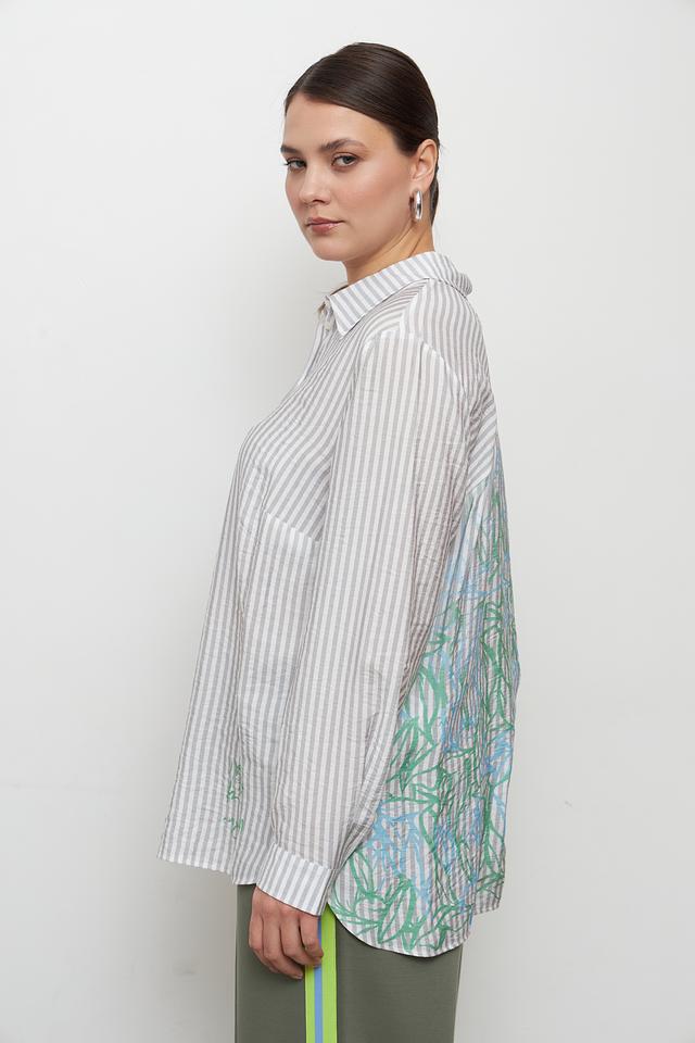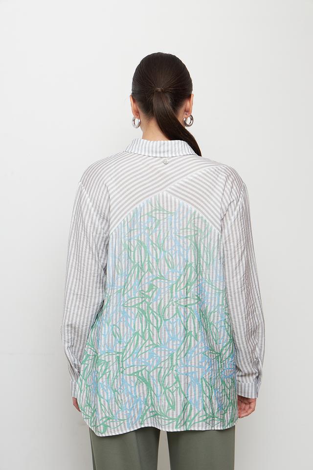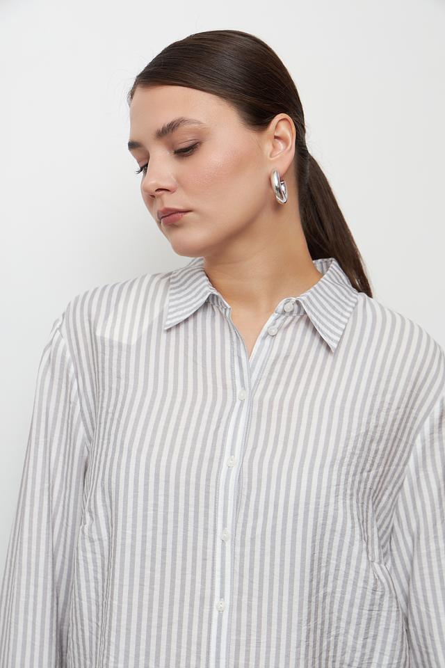 Эта стильная блуза от Lebek станет отличным дополнением к вашему гардеробу. Блуза выполнена в полоску, сочетающую серый и белый цвета, что делает её универсальной и легко сочетаемой с другими вещами.