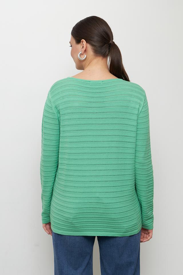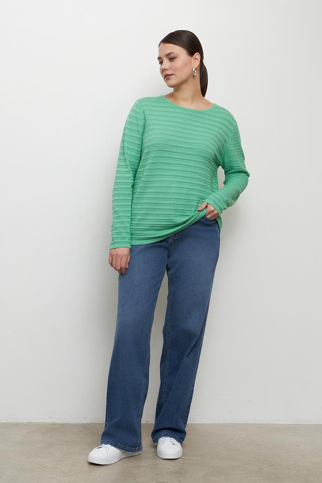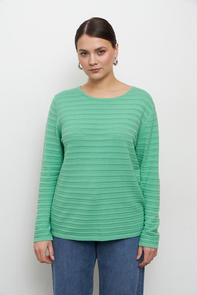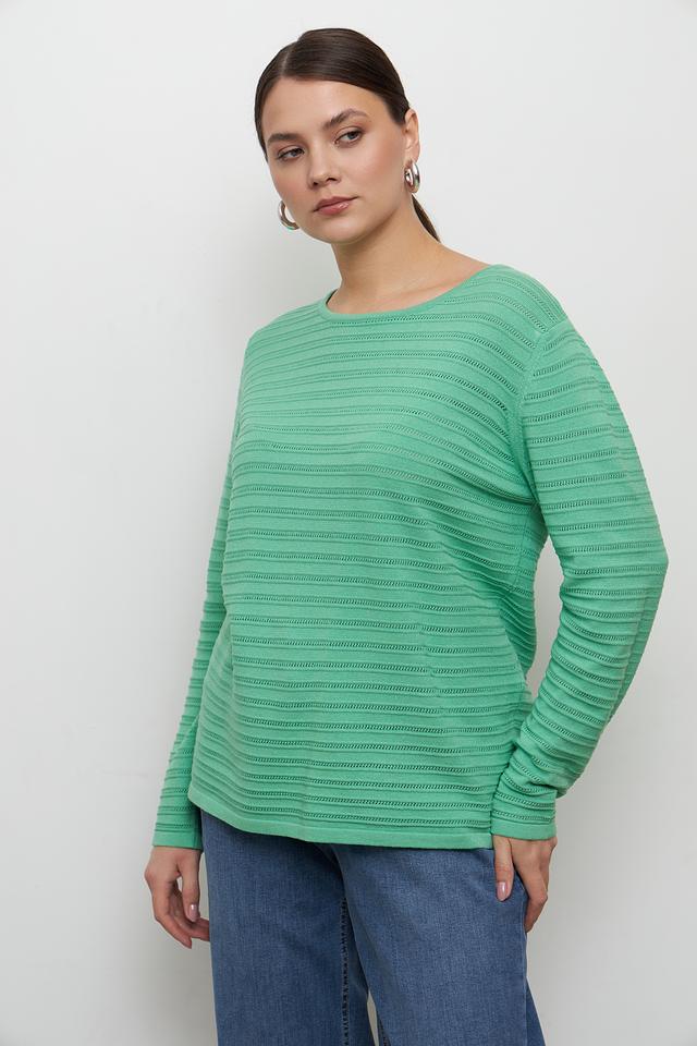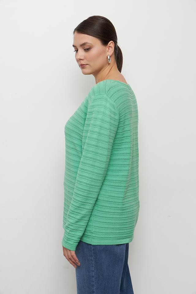 Этот стильный пуловер от Lebek выполнен в нежном зелёном цвете и отличается оригинальной текстурой в виде горизонтальных полосок. Такая вязка придает изделию объём и визуальный интерес.