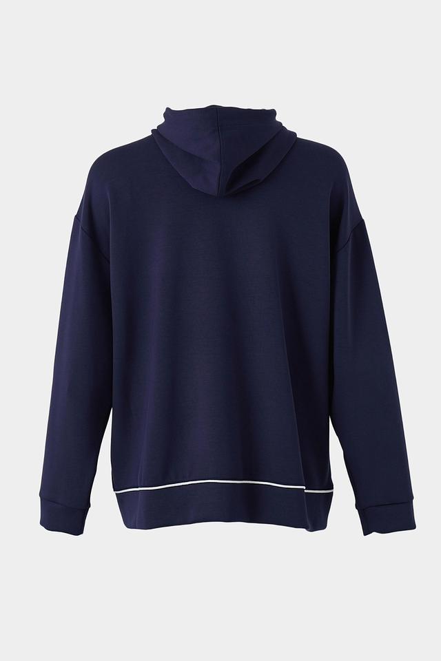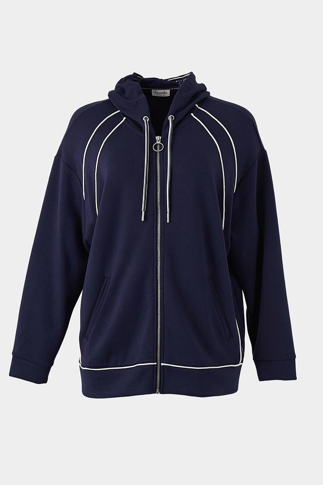 Женский жакет Lebek темно-синего цвета с застежкой на молнию и капюшоном. Модель выполнена из мягкой ткани с контрастными белыми полосами, имеет удобные карманы и свободный крой. Состав: полиэстер 50%, вискоза 45%, эластан 5%