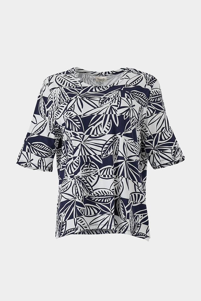 Женская футболка Lebek синего цвета с ярким тропическим принтом. Модель выполнена из мягкой вискозы с добавлением эластана, обеспечивающего комфортную посадку. Идеальный выбор для создания стильного и непринужденного образа. Состав: вискоза 92%, эластан 8%