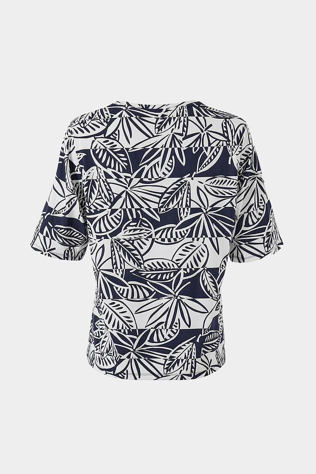 Основной цвет футболки – глубокий синий, который служит идеальным фоном для яркого и выразительного тропического принта. Принт выполнен в белых тонах и изображает стилизованные листья и растительные элементы.