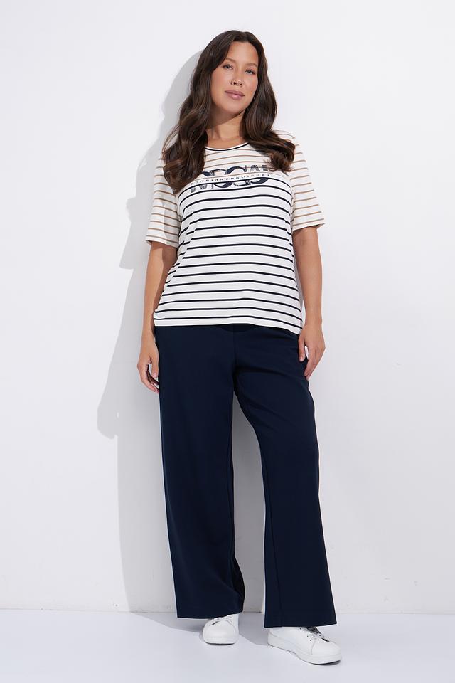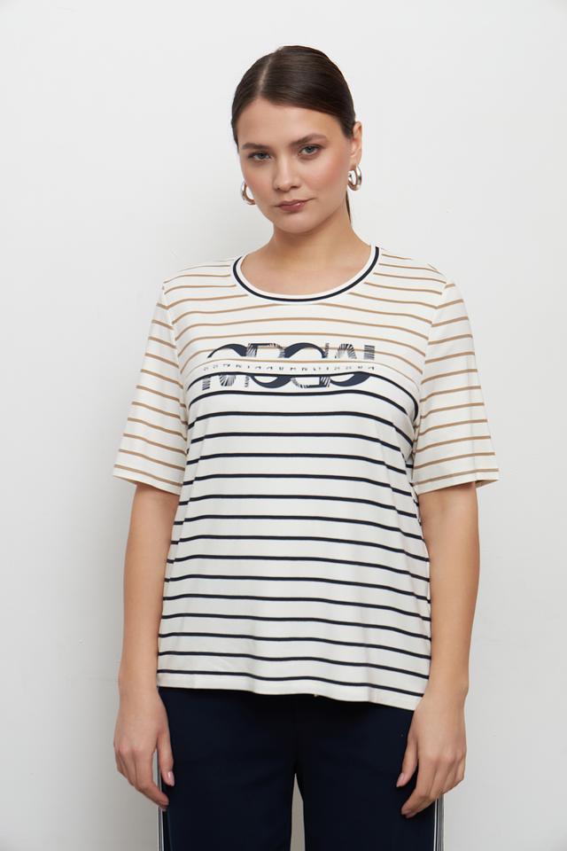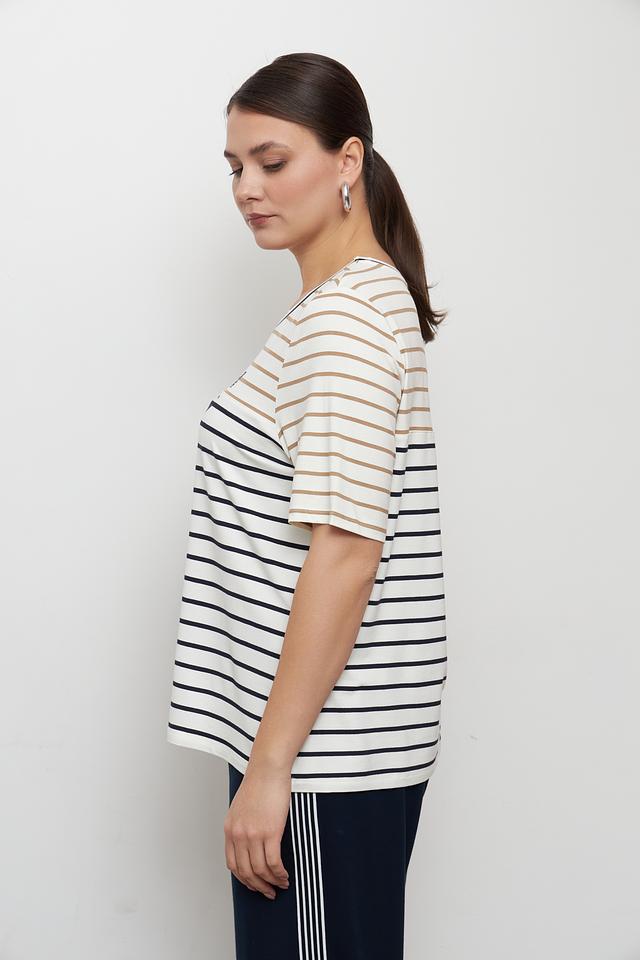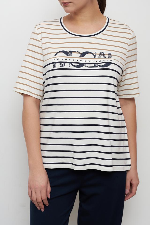 Женская футболка Lebek бежево-синего цвета в горизонтальную полоску с принтом на груди. Изготовлена из мягкой вискозы с добавлением эластана для комфортной посадки и свободы движений. Состав: вискоза 92%, эластан 8%