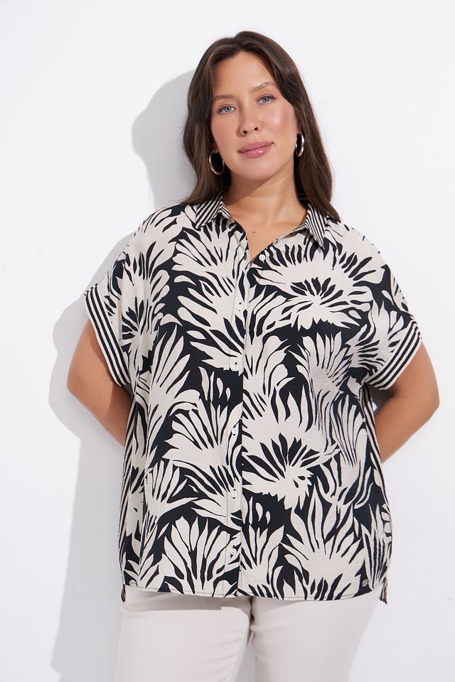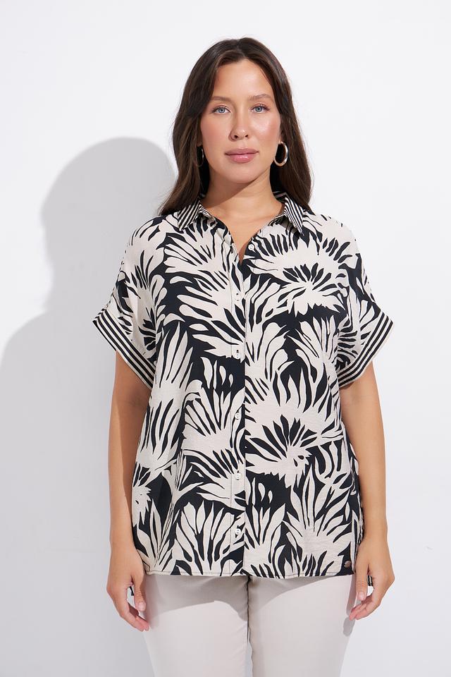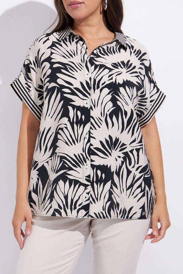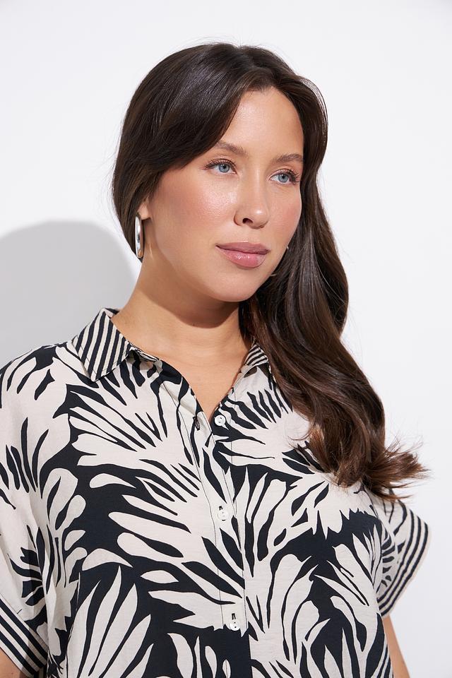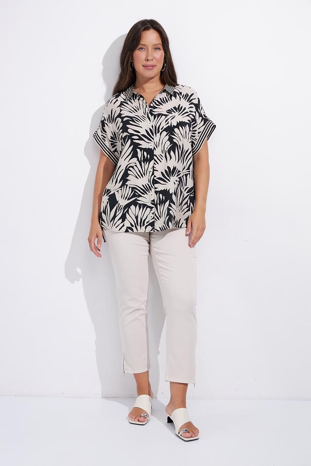 Блуза Lebek белого цвета с ярким чёрным тропическим принтом станет отличным дополнением к вашему гардеробу. Модель свободного кроя с короткими рукавами и классическим воротником. Состав: вискоза 82%, полиамид 18%