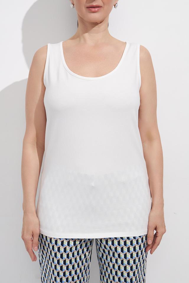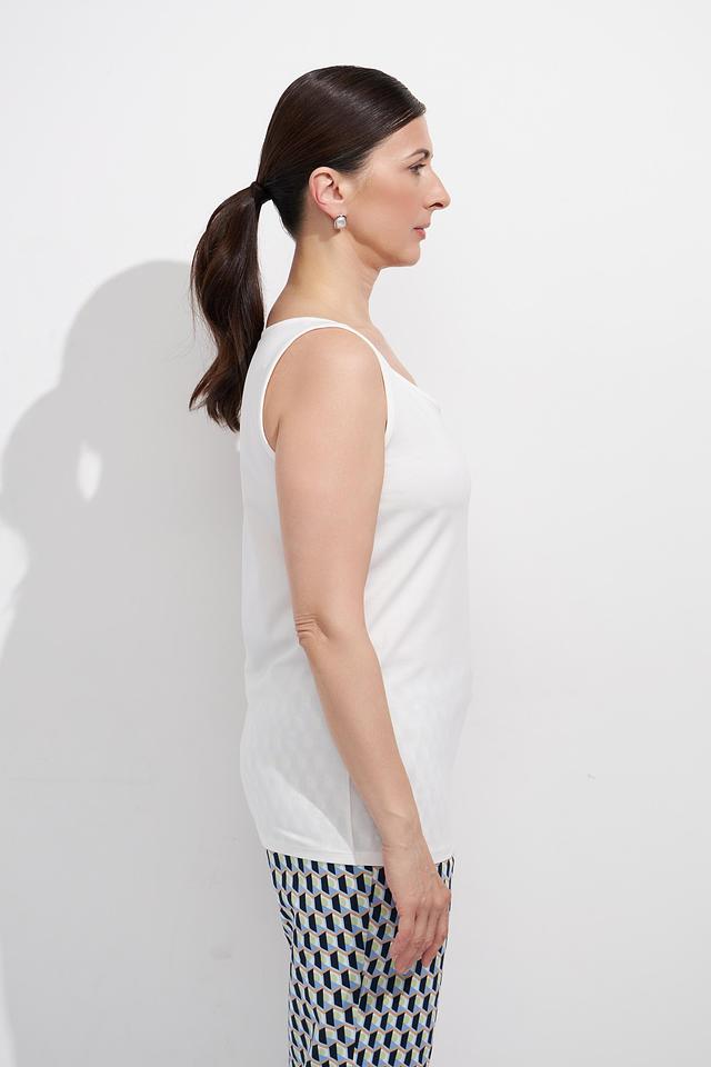 Топ имеет классический крой без рукавов и круглый вырез горловины. Его лаконичный дизайн позволяет сочетать его с различными элементами одежды — от джинсов и брюк до юбок и жакетов.