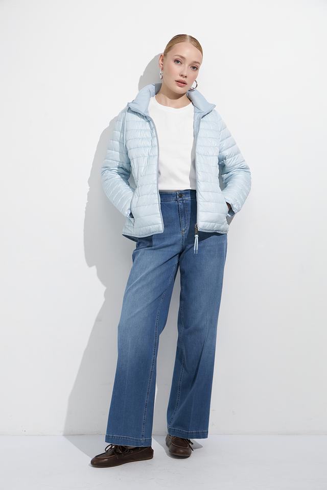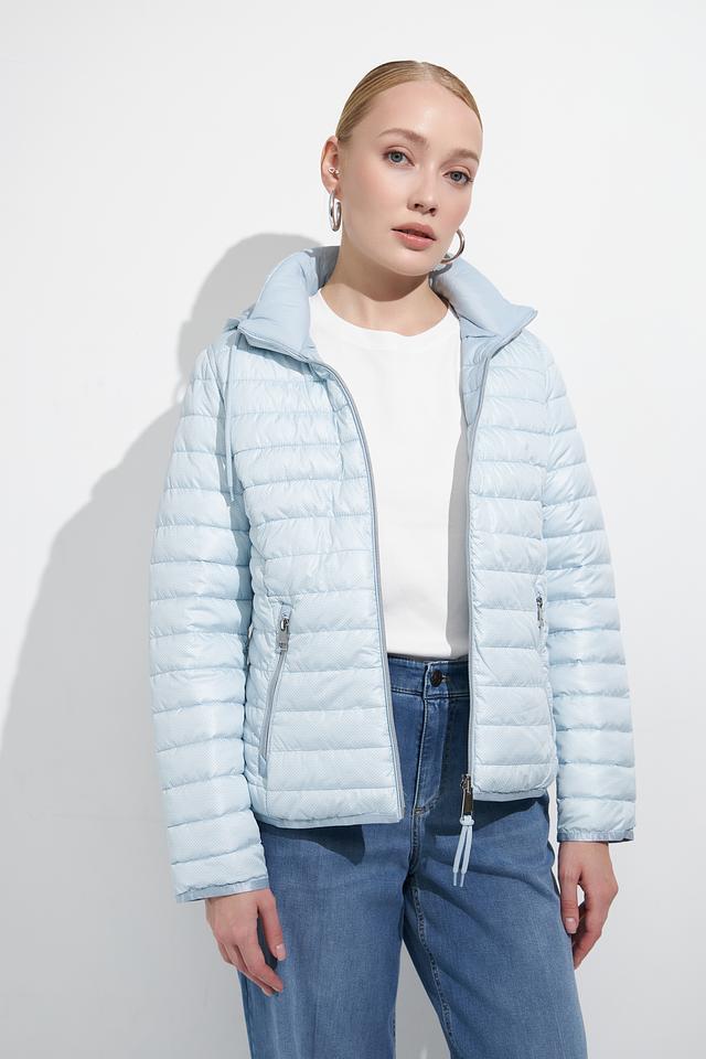 Эта женская куртка от Lebek выполнена в нежном голубом цвете и имеет стеганую фактуру. Куртка застегивается на молнию, имеет капюшон с регулируемыми шнурками и два боковых кармана на молнии.