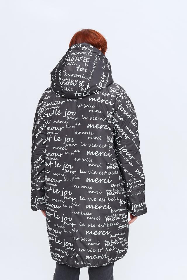 Основной цвет пальто – серый, но его уникальность заключается в ярком и необычном принте, покрывающем часть изделия. Принт выполнен в виде надписей на французском языке, что придает пальто особый шарм и индивидуальность.