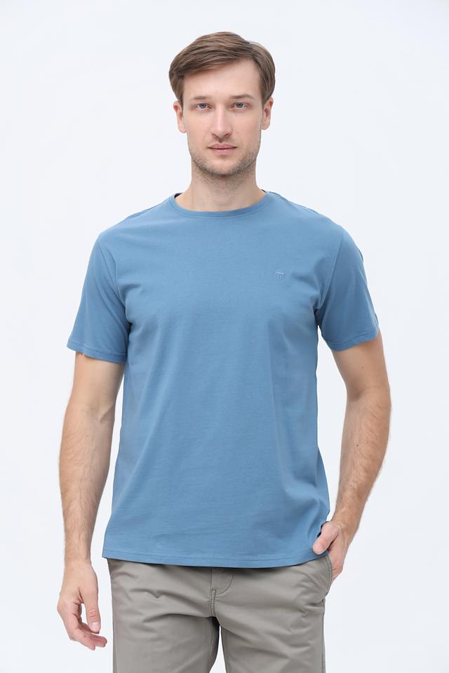 Цвет футболки – голубой, спокойный и универсальный, легко сочетается с различными элементами гардероба. Минималистичный дизайн дополнен небольшим логотипом бренда на груди. Круглый вырез горловины и короткие рукава делают эту футболку идеальным выбором для теплой погоды.