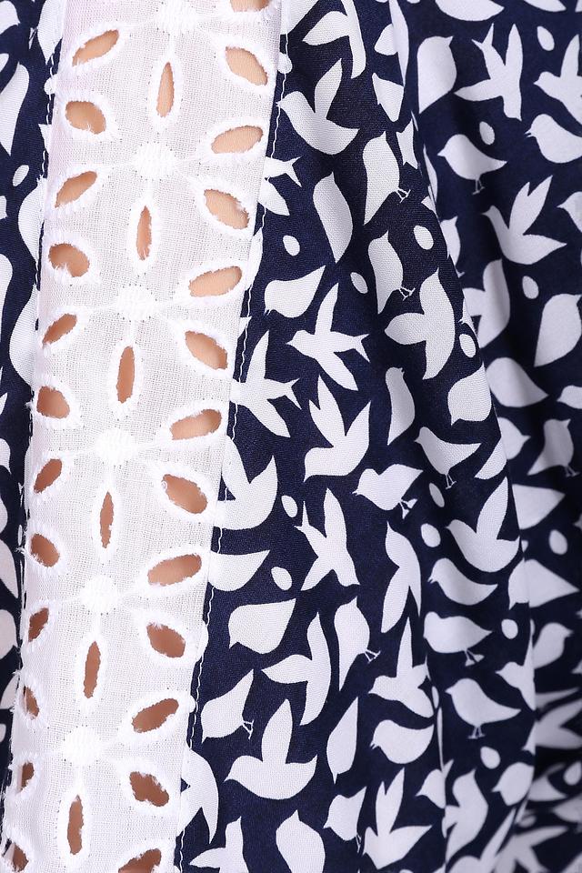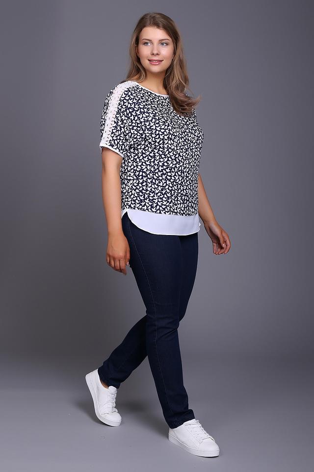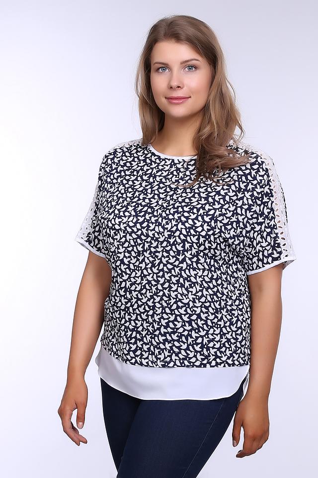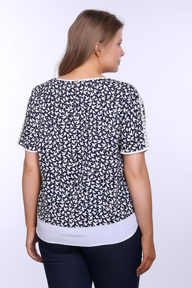 Особенностью данной модели является многослойный дизайн: верхний слой выполнен из легкой ткани с принтом, а нижний – из однотонной белой ткани, создавая интересный контраст. Рукава блузы дополнены декоративным кружевом, придающим образу женственность и изящество.