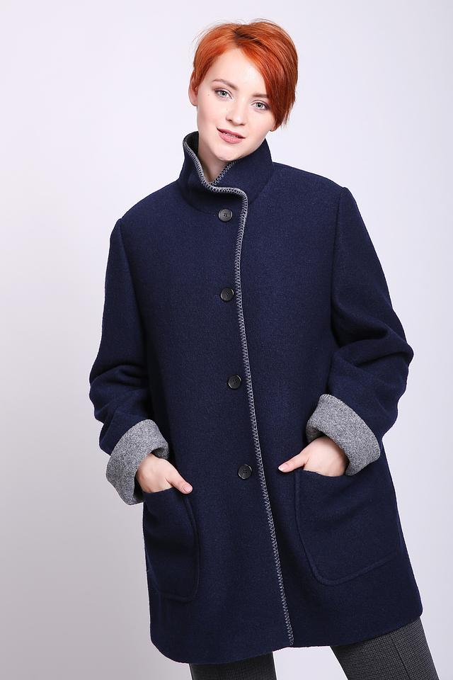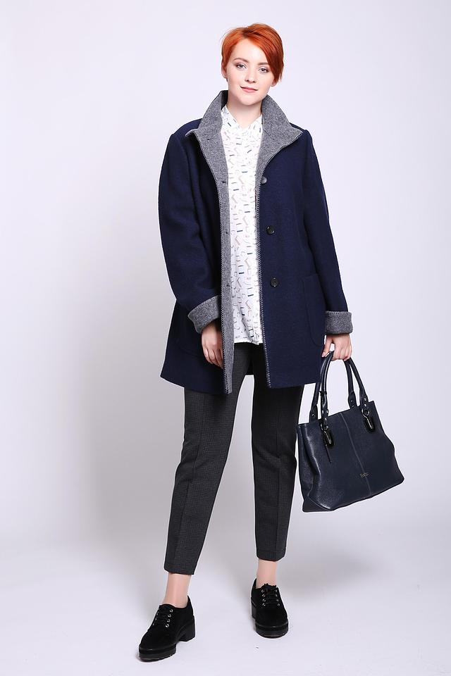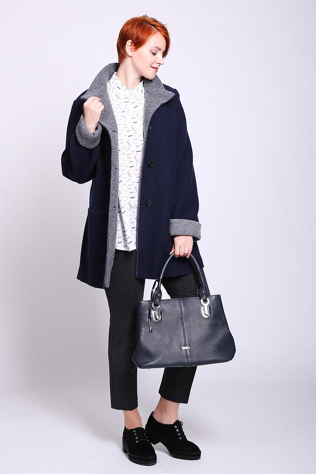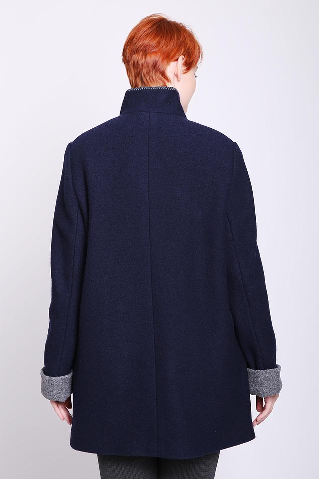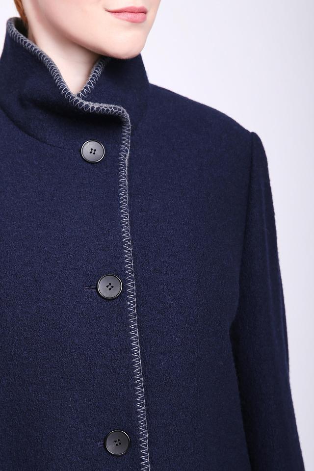 Пальто имеет классический крой, который подходит для различных типов фигур. Тёмно-синий цвет придает изделию благородный и универсальный вид. Отличительной особенностью пальто является контрастная отделка манжет и воротника светло-серым материалом, что добавляет ему оригинальности.