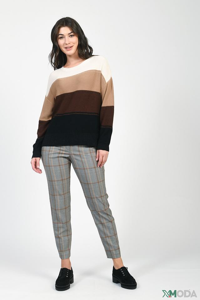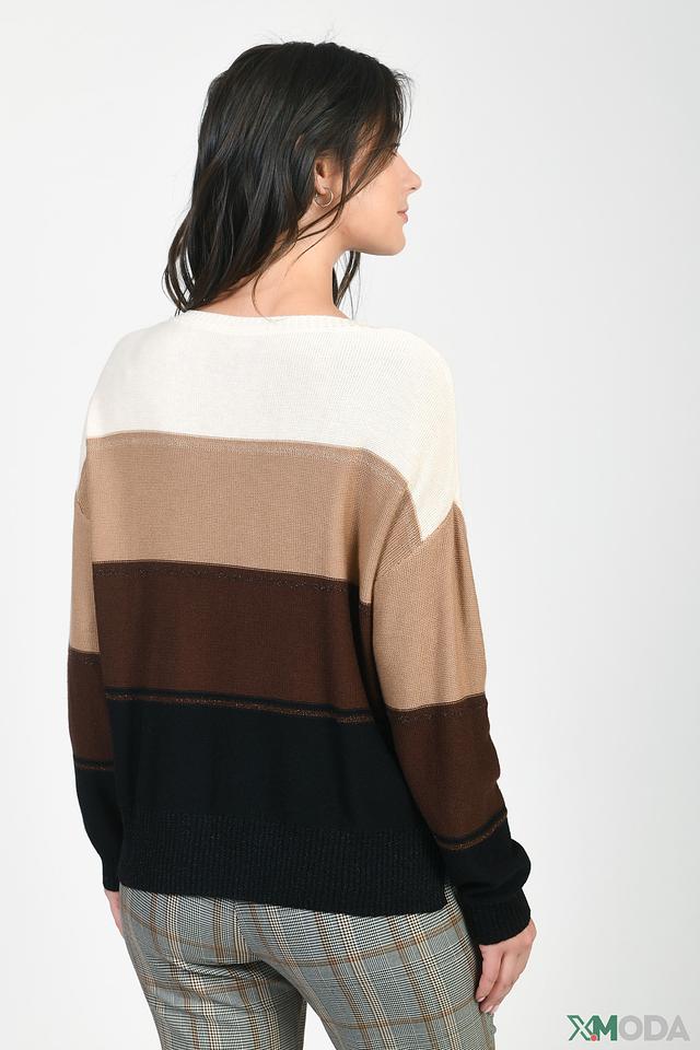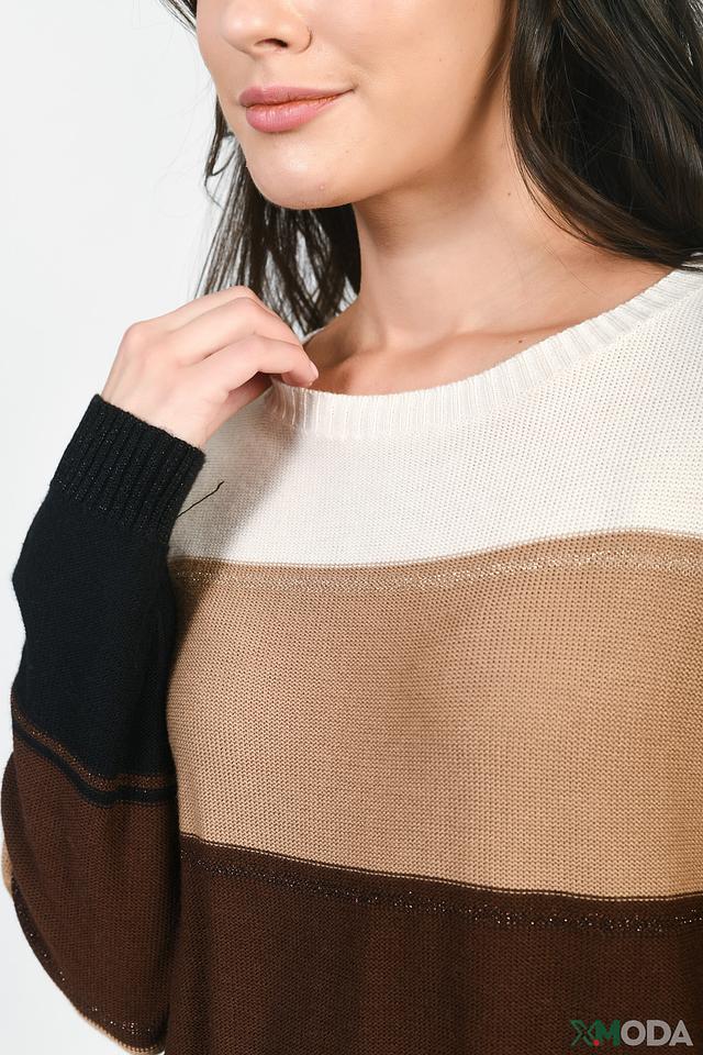 Пуловер имеет оригинальный дизайн с горизонтальными полосами бежевого, коричневого и черного цветов. Круглый вырез горловины и свободный крой делают его удобным в носке и подходящим для различных образов. Рукава слегка спущены, что придает модели расслабленный вид.