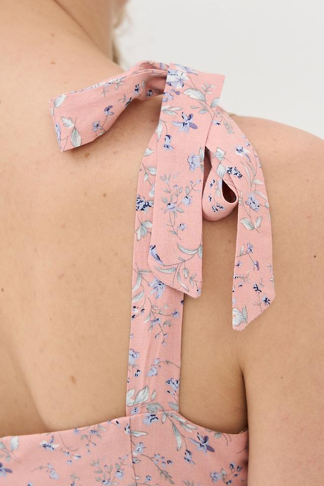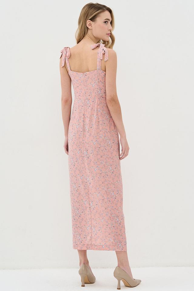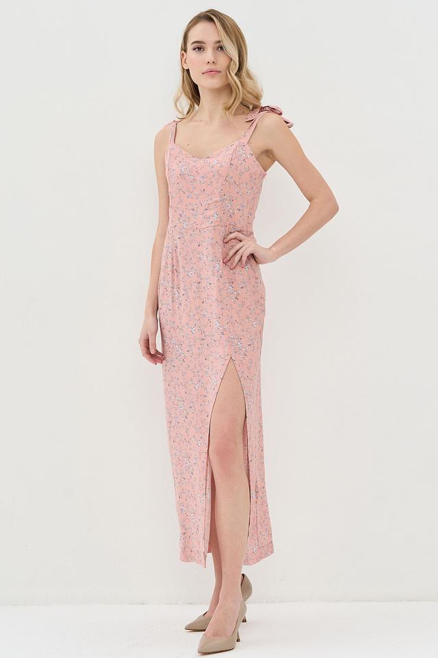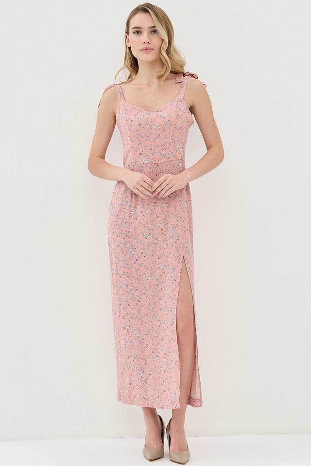 Платье имеет прямой силуэт, длину миди и тонкие бретели с завязками. Вырез горловины – квадратный. Боковой разрез добавляет образу легкости и игривости.