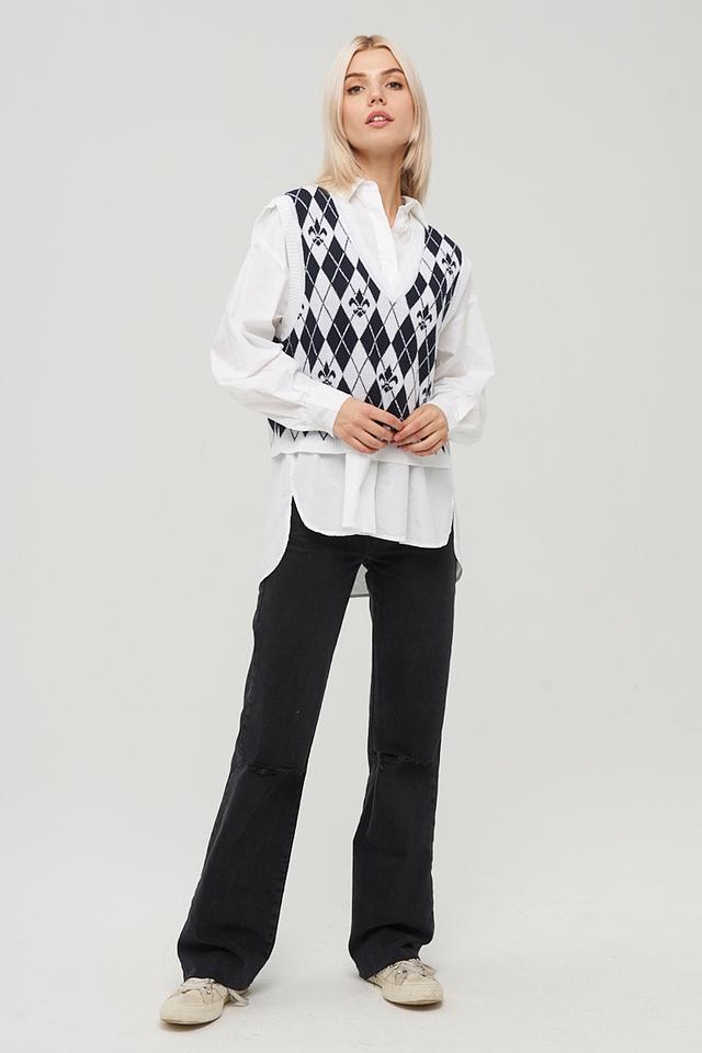 Женский жилет BE YOU чёрно-белого цвета с ромбовидным узором и узором "лилия". Модель выполнена из мягкой пряжи с добавлением шерсти, что обеспечивает комфорт и тепло. Идеально дополнит повседневный образ. Состав: пан 70%, шерсть 30%