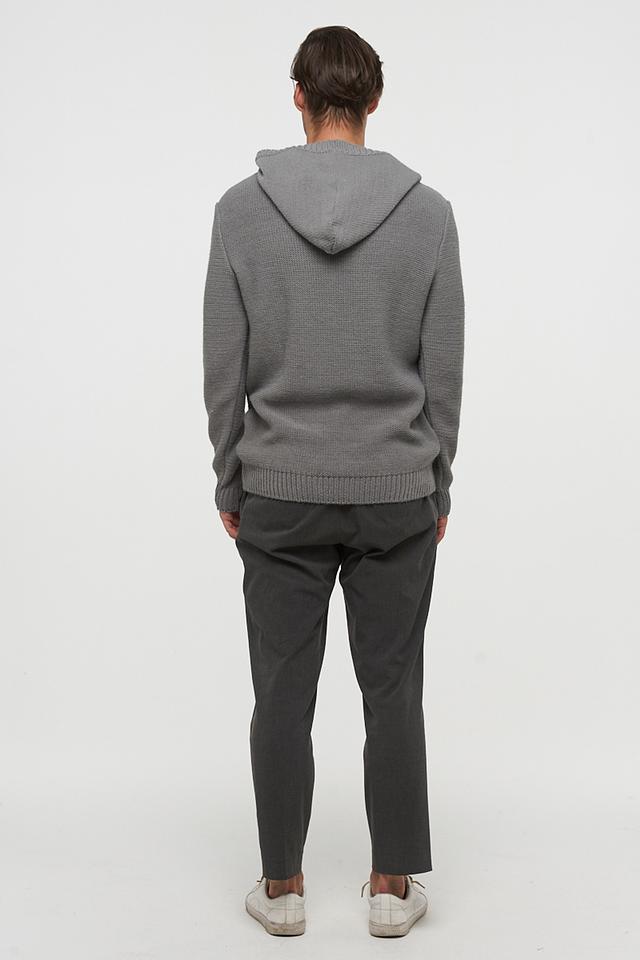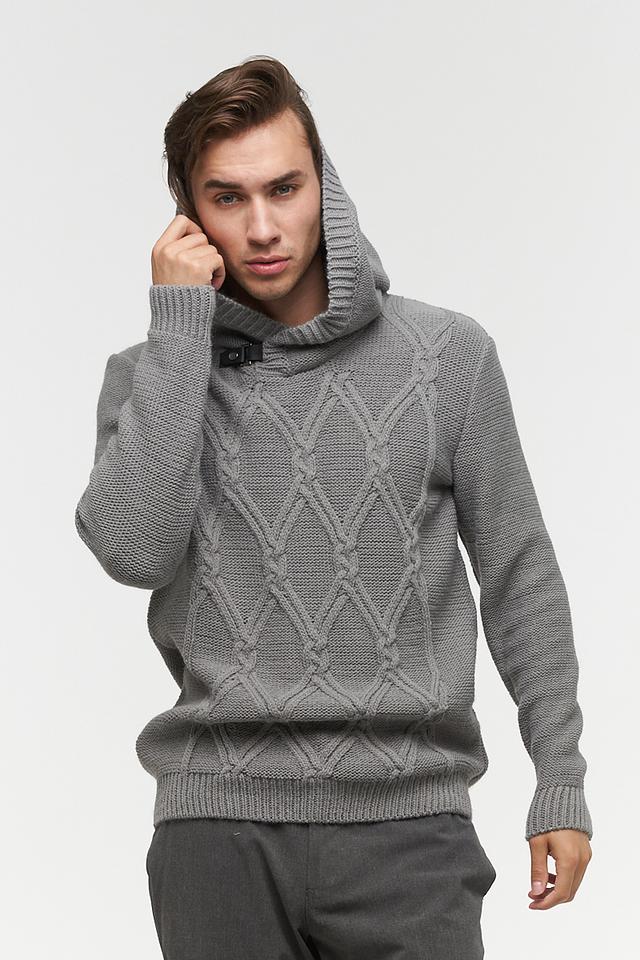 Передняя часть джемпера украшена рельефным узором в виде косы, придающим изделию текстуру и визуальный интерес. Капюшон добавляет практичности и позволяет создать более расслабленный образ.
