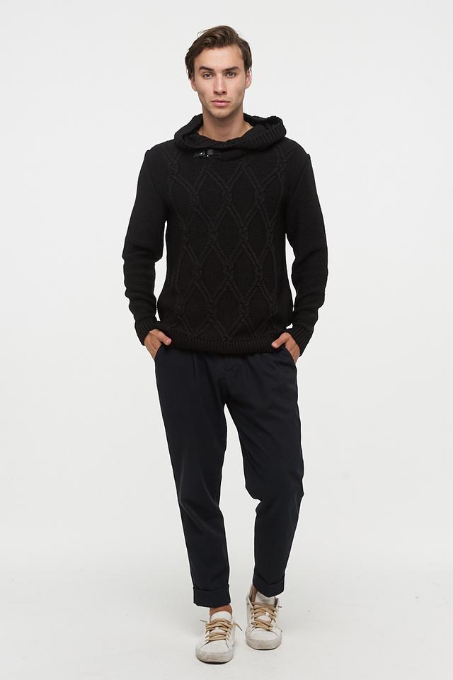 Чёрный джемпер BE YOU с капюшоном и фактурной вязкой. Изготовлен из сочетания мягкого хлопка и шерсти, обеспечивающих комфорт и тепло. Стильный и универсальный выбор для создания повседневных образов. Состав: пан 70%, шерсть 30%