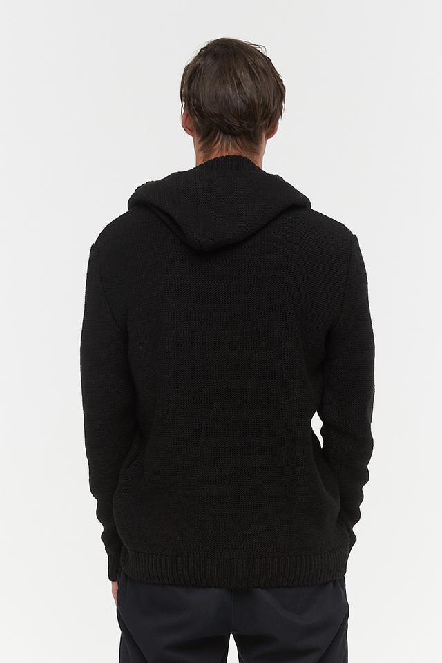 Мужской джемпер от BE YOU выполнен в классическом чёрном цвете. Модель имеет капюшон и застёжку на пуговицы в верхней части. Передняя часть джемпера украшена рельефным узором в виде ромбов, придающим изделию объём и текстуру.