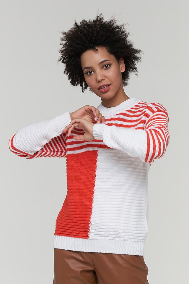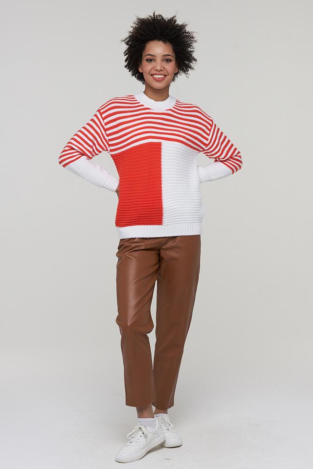Женский джемпер BE YOU красного и белого цвета с оригинальным дизайном в полоску и геометрическими вставками. Изготовлен из мягкого и приятного к телу сочетания шерсти и пана. Состав: пан 70%, шерсть 30%