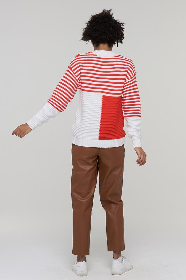 Этот стильный джемпер от BE YOU станет ярким акцентом вашего образа. Модель выполнена в сочетании красного и белого цветов, с оригинальным дизайном в полоску и геометрическими вставками.