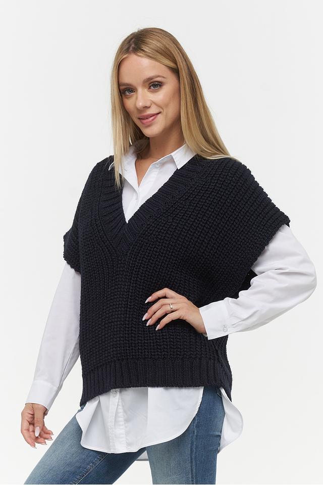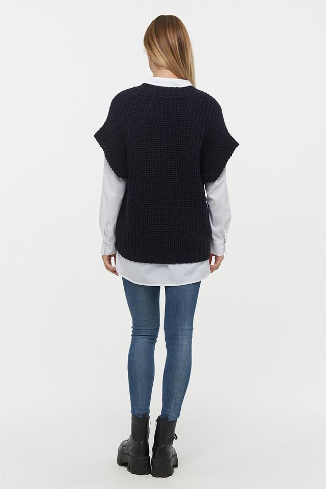 Жилет имеет классический V-образный вырез и свободный, слегка заниженный силуэт, который позволяет создавать многослойные образы. Крупная вязка придает изделию текстуру и объём.