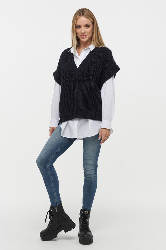 Чёрный вязаный жилет BE YOU – стильный и комфортный элемент гардероба. Модель выполнена из мягкой шерсти и пана, имеет V-образный вырез и свободный крой. Идеально сочетается с рубашками и джинсами. Состав: шерсть 50%, пан 50%