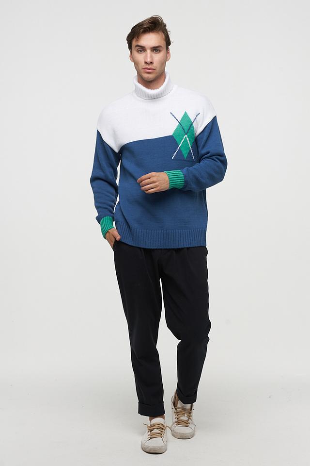 Водолазка имеет классический крой и удобную посадку по фигуре. Основной цвет – насыщенный синий, который дополнен белыми и зелёными элементами, образующими геометрический узор. Высокий воротник-стойка обеспечивает дополнительную защиту от холода.
