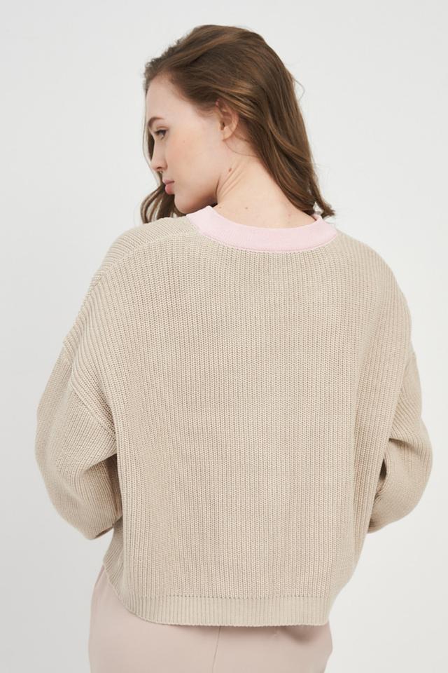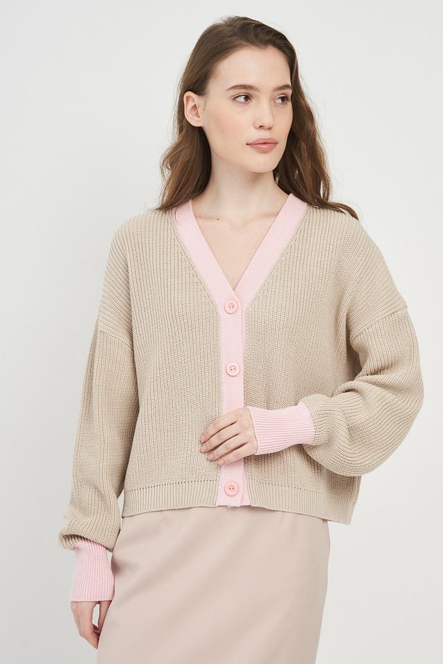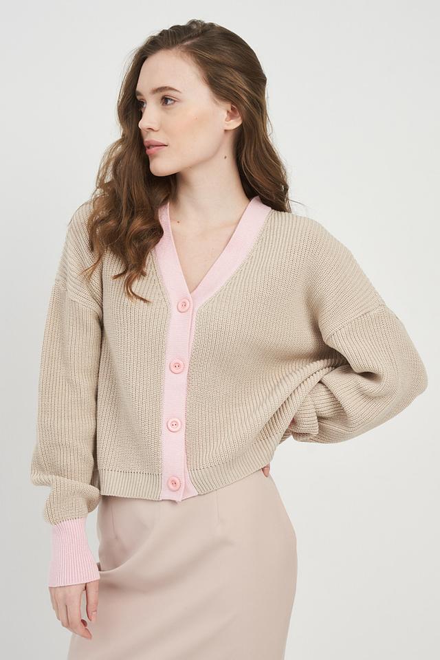 Кардиган имеет бежевый цвет с розовой отделкой по краю и на планке с пуговицами. Свободный крой и рукава-фонарики придают модели современный и непринужденный вид. Короткая длина делает его идеальным для создания модных образов.