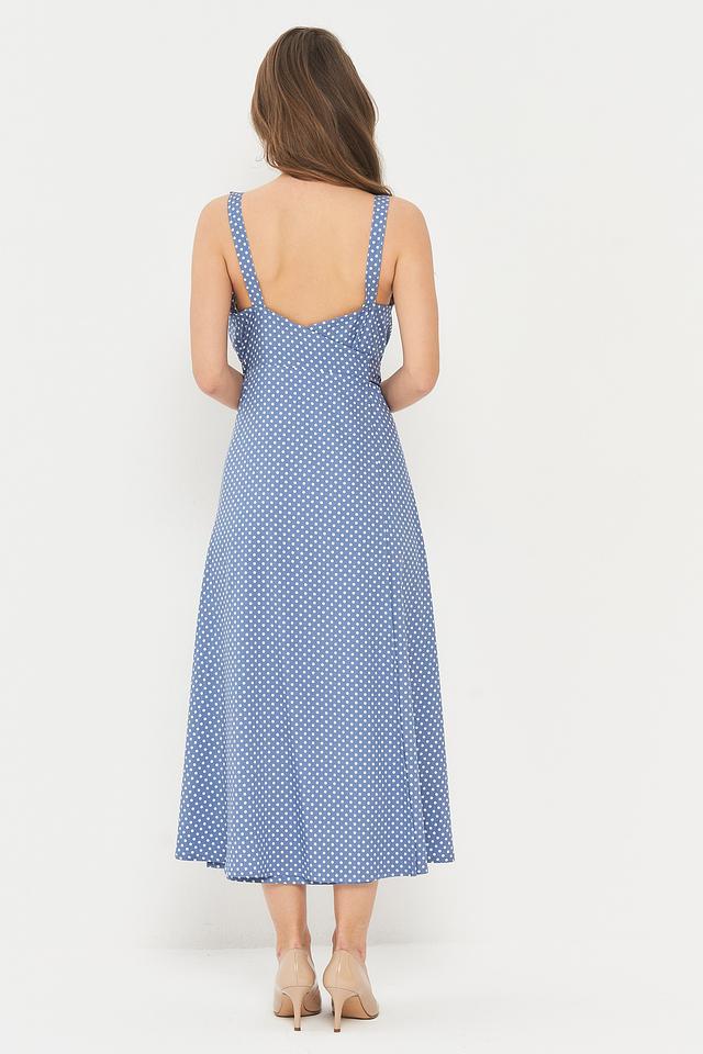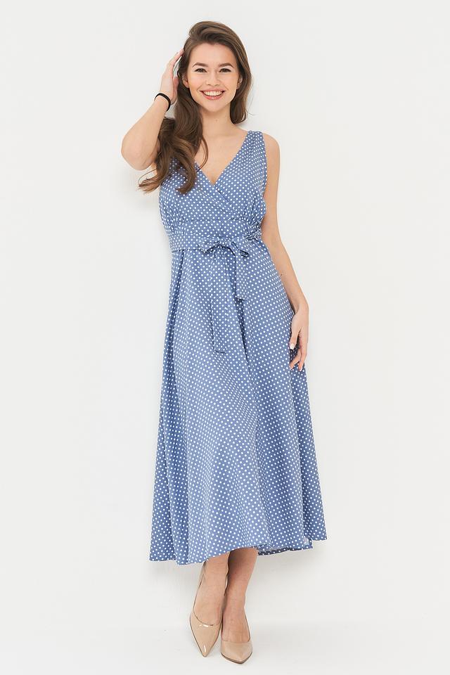 Это длинное платье от бренда BE YOU выполнено в нежном голубом цвете и украшено мелким белым горошком, создавая романтичный и свежий образ.