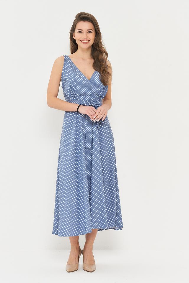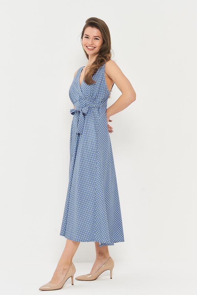 Платье BE YOU голубого цвета с мелким белым горошком – это стильное и лёгкое решение для летнего гардероба. Модель с V-образным вырезом и завязками на талии подчеркнёт фигуру и создаст женственный силуэт. Состав: