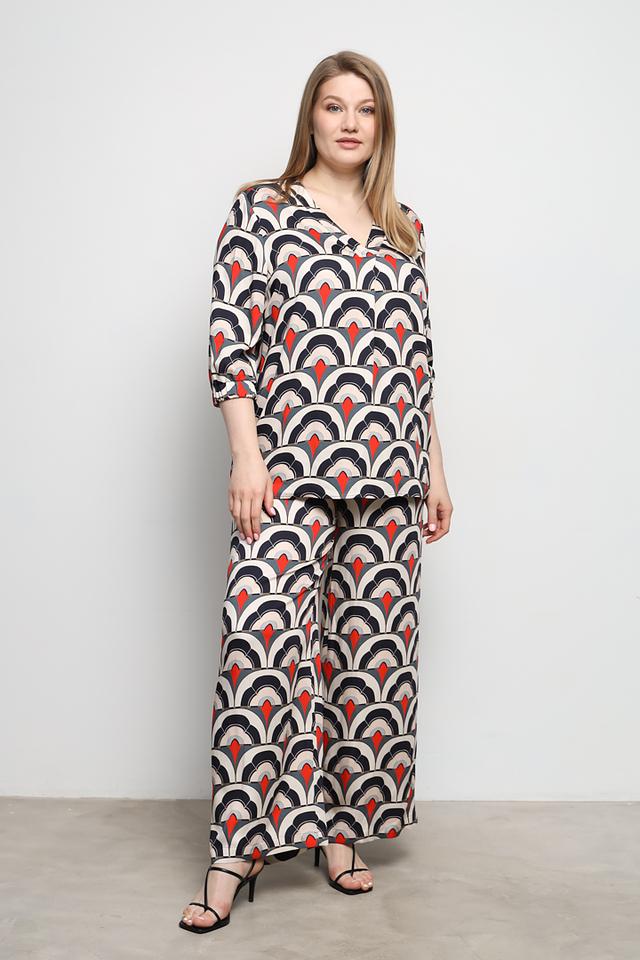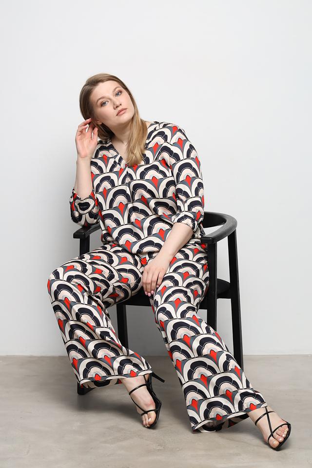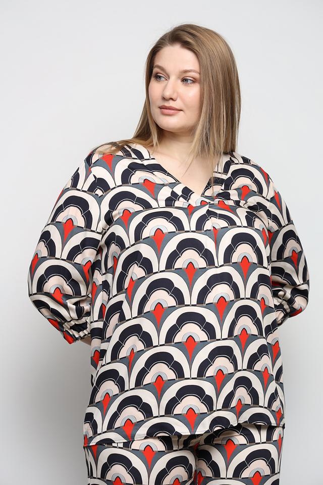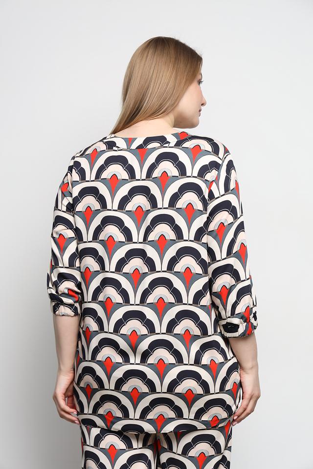 Особенностью данной модели является оригинальный геометрический принт, сочетающий в себе белый, красный и черный цвета. V-образный вырез подчеркивает линию шеи, а рукава ¾ придают образу элегантность.