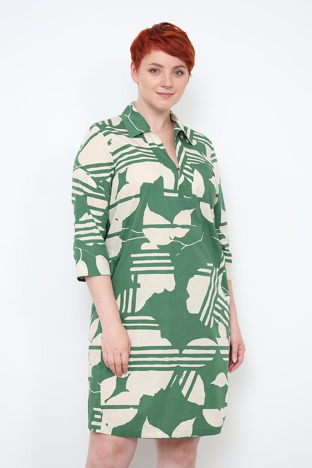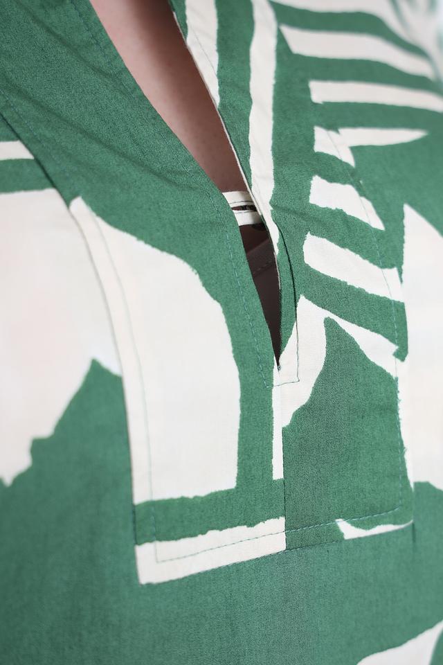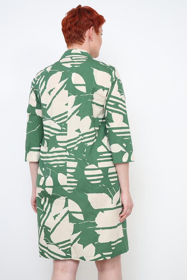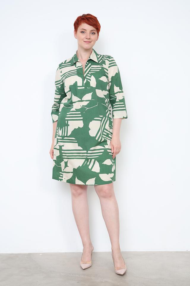 Платье имеет прямой силуэт, короткий рукав и воротник-стойку с V-образным вырезом, который добавляет образу изящества. Особенностью модели является яркий зелёный принт в виде абстрактных листьев и полос на бежевом фоне.