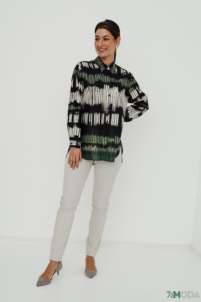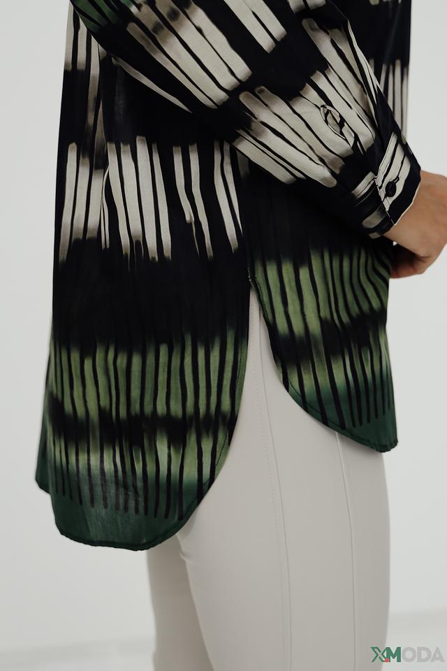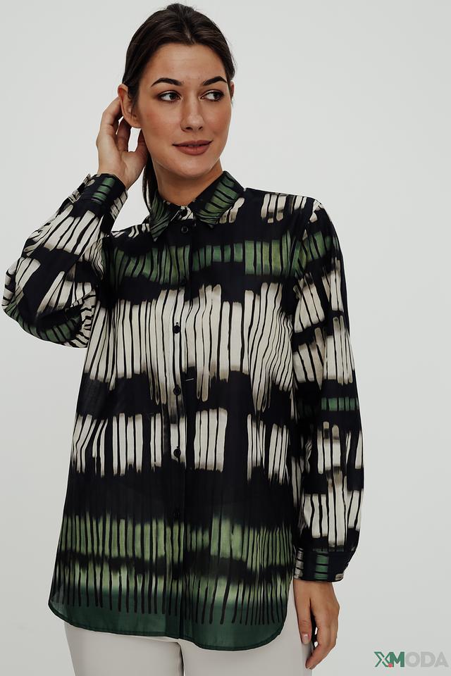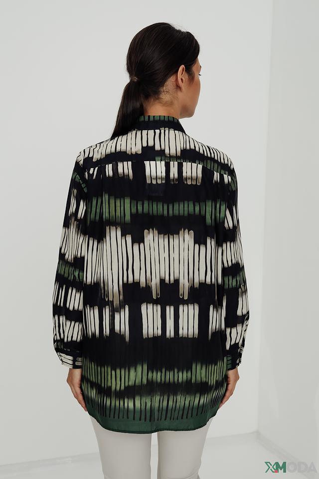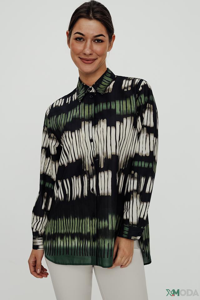 Рубашка имеет длинный рукав и классический крой, который подходит для различных типов фигур. Главная особенность модели – яркий и необычный принт, выполненный в сочетании зеленых, белых и черных оттенков. Этот принт добавляет рубашке индивидуальности и делает ее заметной деталью вашего образа.