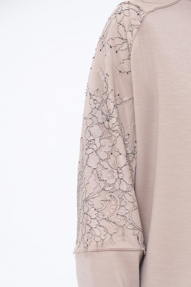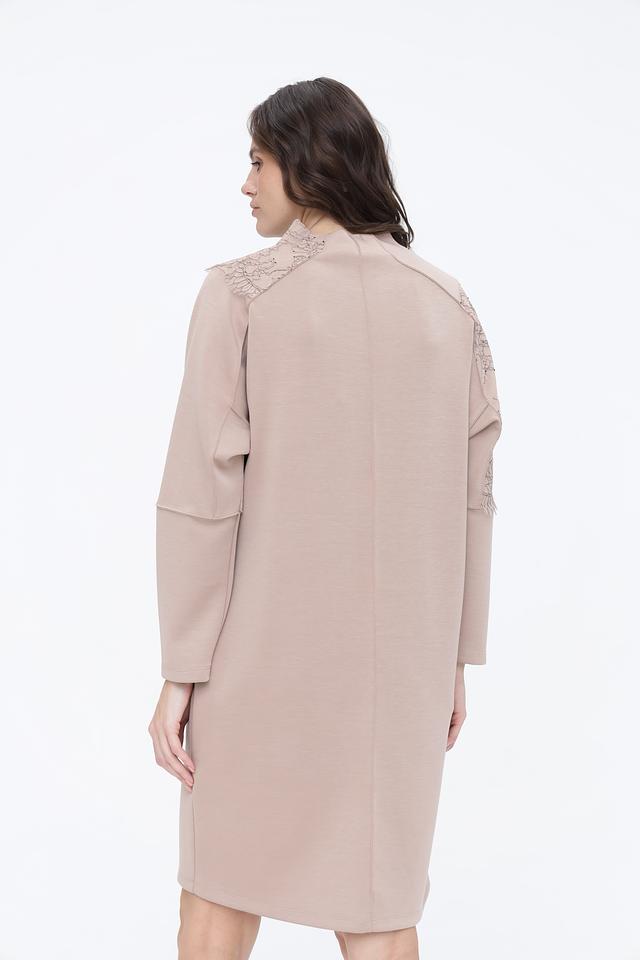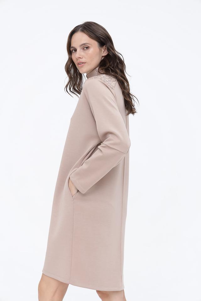 Платье имеет прямой, слегка зауженный к низу силуэт, который визуально стройнит фигуру. Высокий воротник-стойка добавляет элегантности, а длинные рукава с декоративными вставками из кружева придают платью изысканность. Кружево выполнено в тон основной ткани, создавая гармоничный образ.