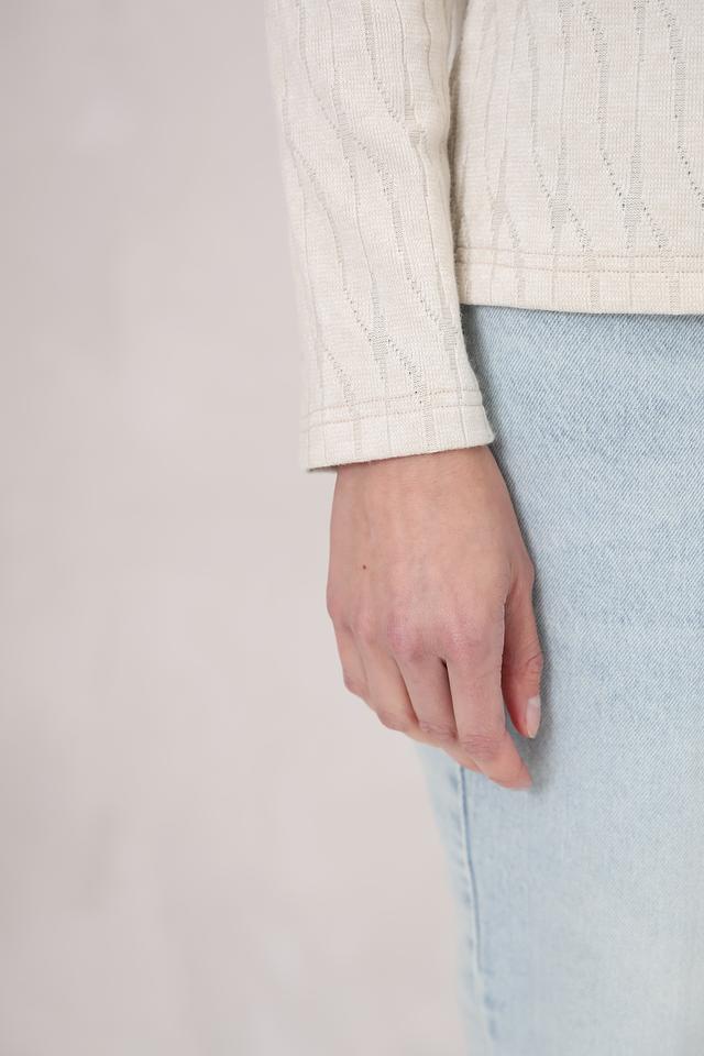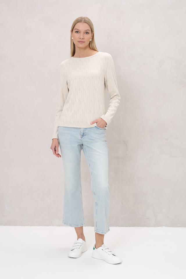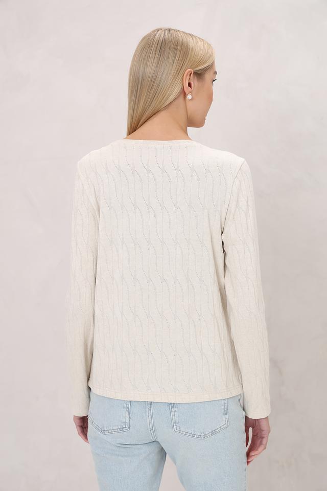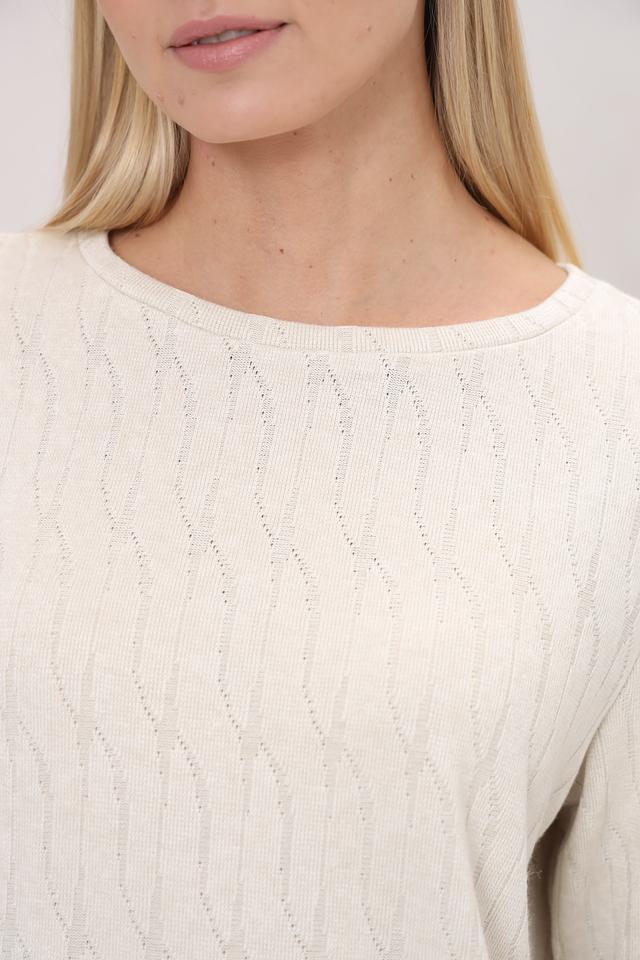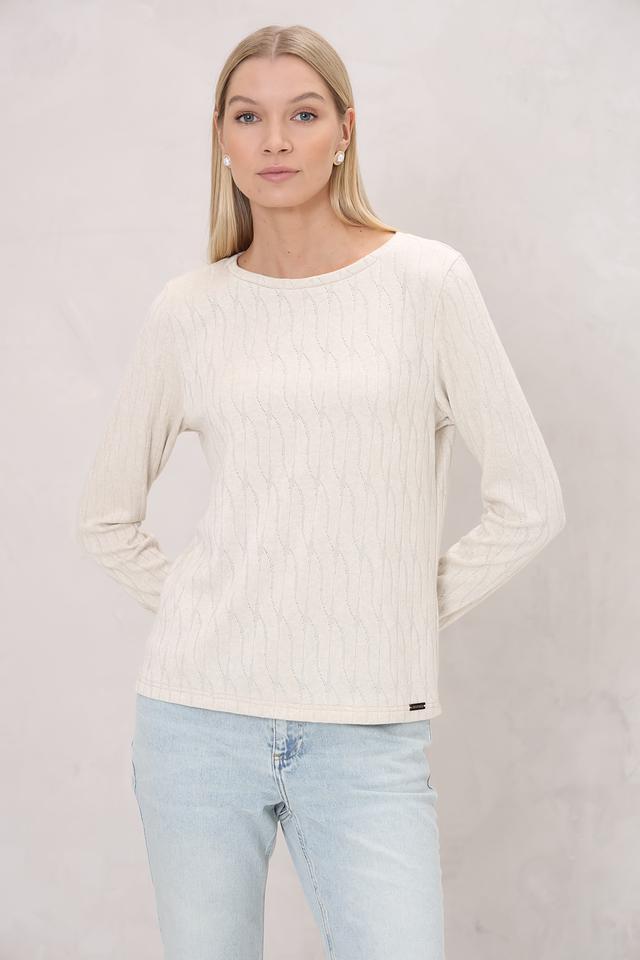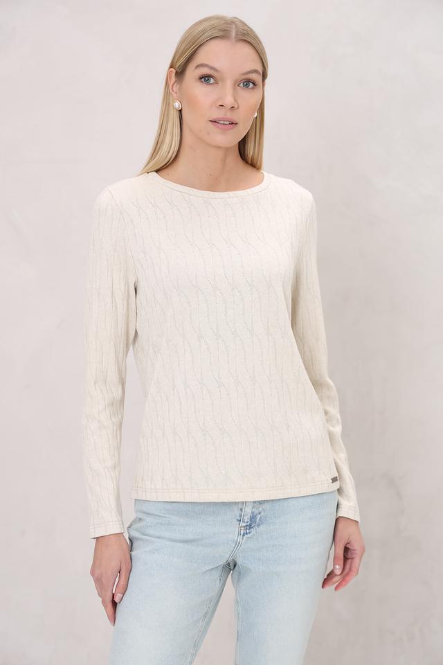 Эта блуза от Beatris выполнена в нежном кремовом цвете и отличается оригинальным узором в виде кос. Модель имеет длинные рукава и круглый вырез горловины, что делает ее универсальной для различных образов.