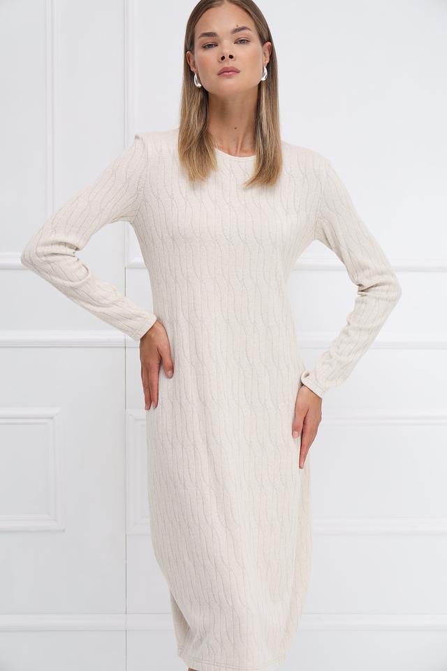 Платье имеет приталенный силуэт, который подчеркивает фигуру, и длинные рукава, делая его подходящим для прохладной погоды. Рельефный узор в виде кос придает изделию изысканность и текстуру.