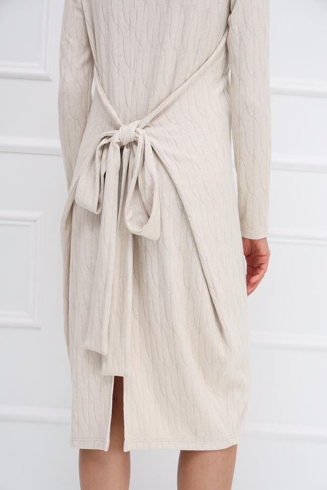 Бежевое платье от Beatris выполнено из мягкого вязаного полотна с рельефным узором. Модель имеет длинные рукава и приталенный силуэт, а пояс с завязками на спине подчеркивает талию. Состав: вискоза 50%, полиэстер 25%, нейлон 22%, спандекс 3%