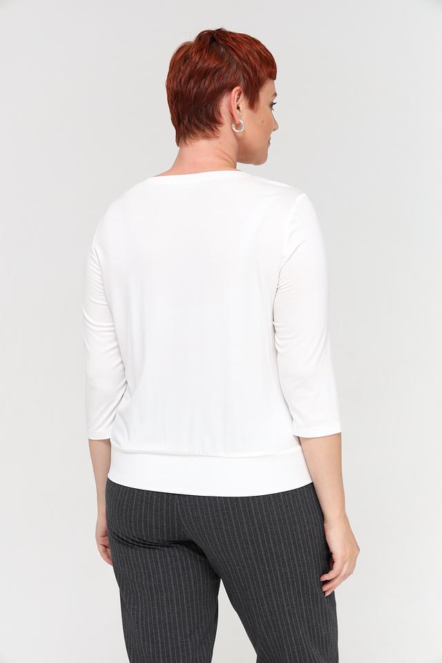 Блуза имеет классический крой с округлым вырезом горловины и рукавом три четверти. Отсутствие декоративных элементов подчеркивает ее минималистичный стиль. Благодаря своему лаконичному дизайну, эта блуза легко вписывается в деловой и повседневный гардероб.