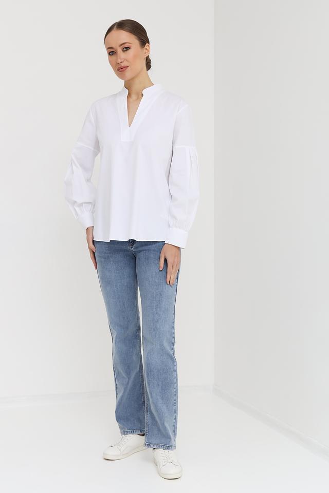Модель имеет свободный крой, который не сковывает движения и позволяет создать расслабленный, но при этом элегантный образ. V-образный вырез горловины добавляет изящества, а рукава-фонарики придают блузе романтичный вид.