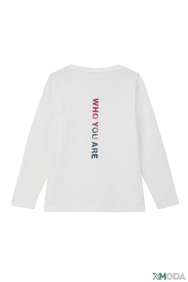 Модель имеет длинный рукав и классический круглый вырез горловины. Оригинальности образу придают надписи на лицевой и задней стороне футболки, выполненные в контрастных цветах – розовом и синем. Надпись на груди гласит “REMEMBER”, а на спине – “WHO YOU ARE”.