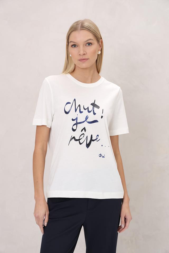 Белая футболка от Oui с оригинальным принтом "Chut! je rêve...". Изготовлена из 100% хлопка, обеспечивая комфорт и воздухопроницаемость. Стильный и лаконичный дизайн делает эту футболку отличным выбором для повседневного образа. Состав: хлопок 100%