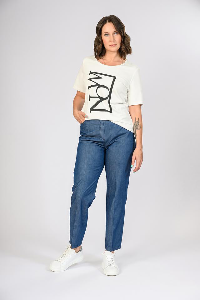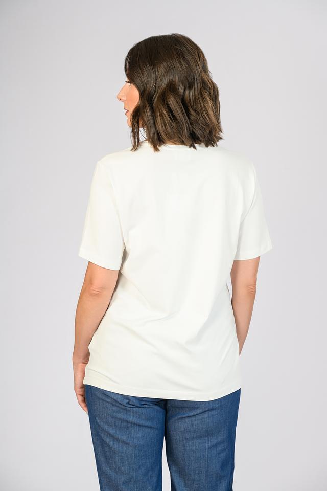 Футболка имеет прямой крой и короткий рукав. Основной цвет – белый, что делает ее универсальной и легко сочетаемой с другими элементами одежды.