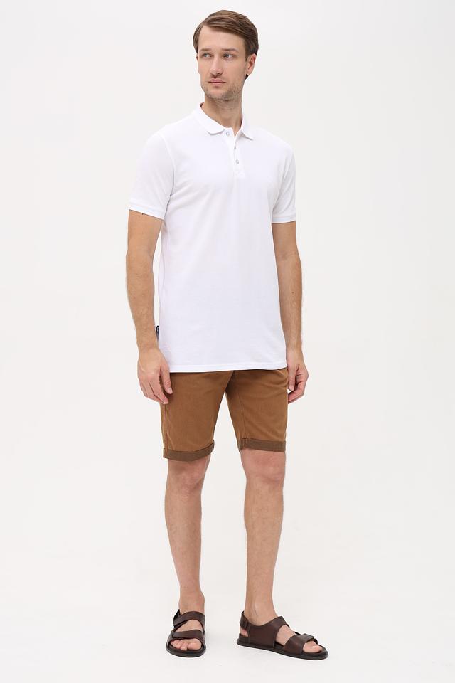 Поло имеет короткий рукав и стандартный крой, обеспечивающий свободу движений. Воротник выполнен из эластичного трикотажа, что делает его удобным в носке. Застёжка на три пуговицы в тон изделия.